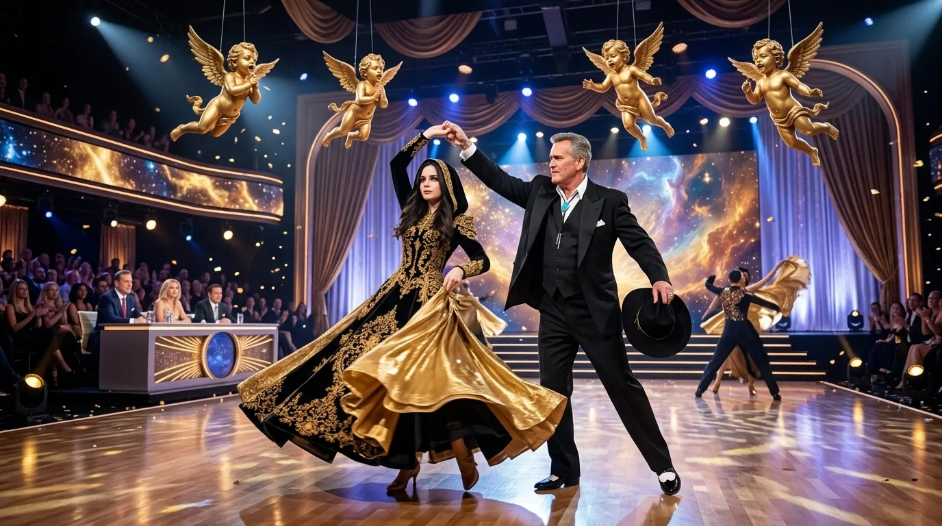 The girl with hoodie golden dress  meets Bruce Campbell in a dancing show.They dancing