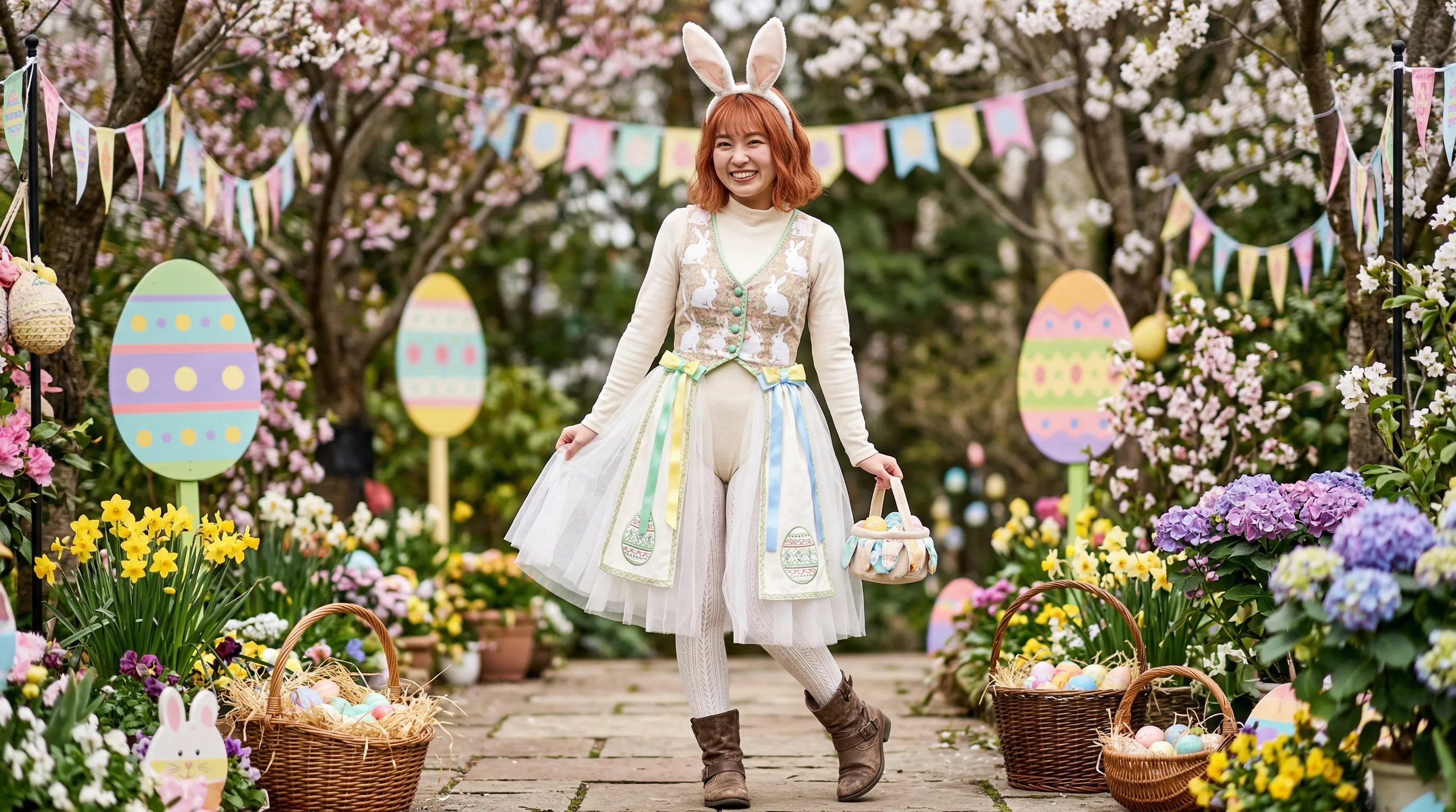 Full-body image of a hot, very beautiful, very slim red-haired Japanese woman with voluptuous breasts in a skimpy, provocative, skin-tight Easter bunny macrokinis consisting only of very thin strips of white fur with a provocative, very low neckline, bright colors, playful bunny ears, sparkling eyes, and a mischievous smile in front of a colorful, festive, lascivious Easter background with no other people.