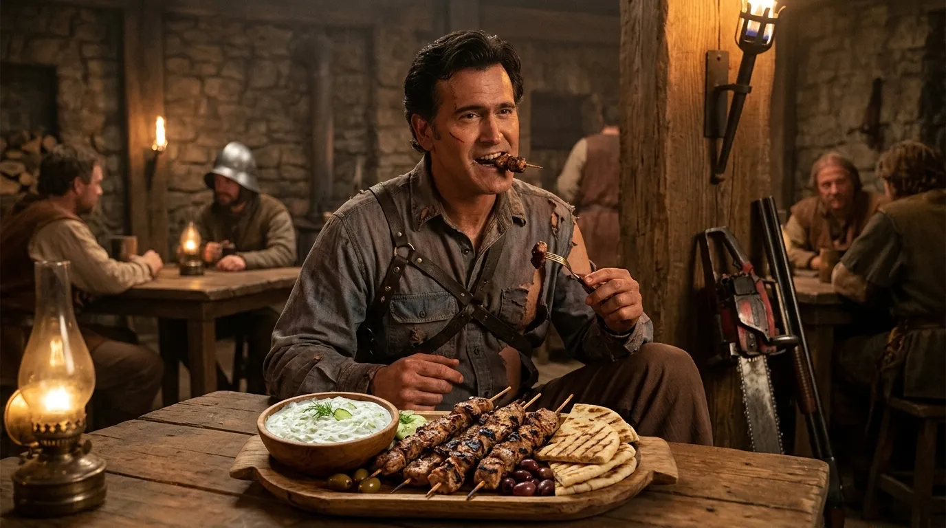 Young Ash stops in a tavern to eat souvlaki with tzatziki.