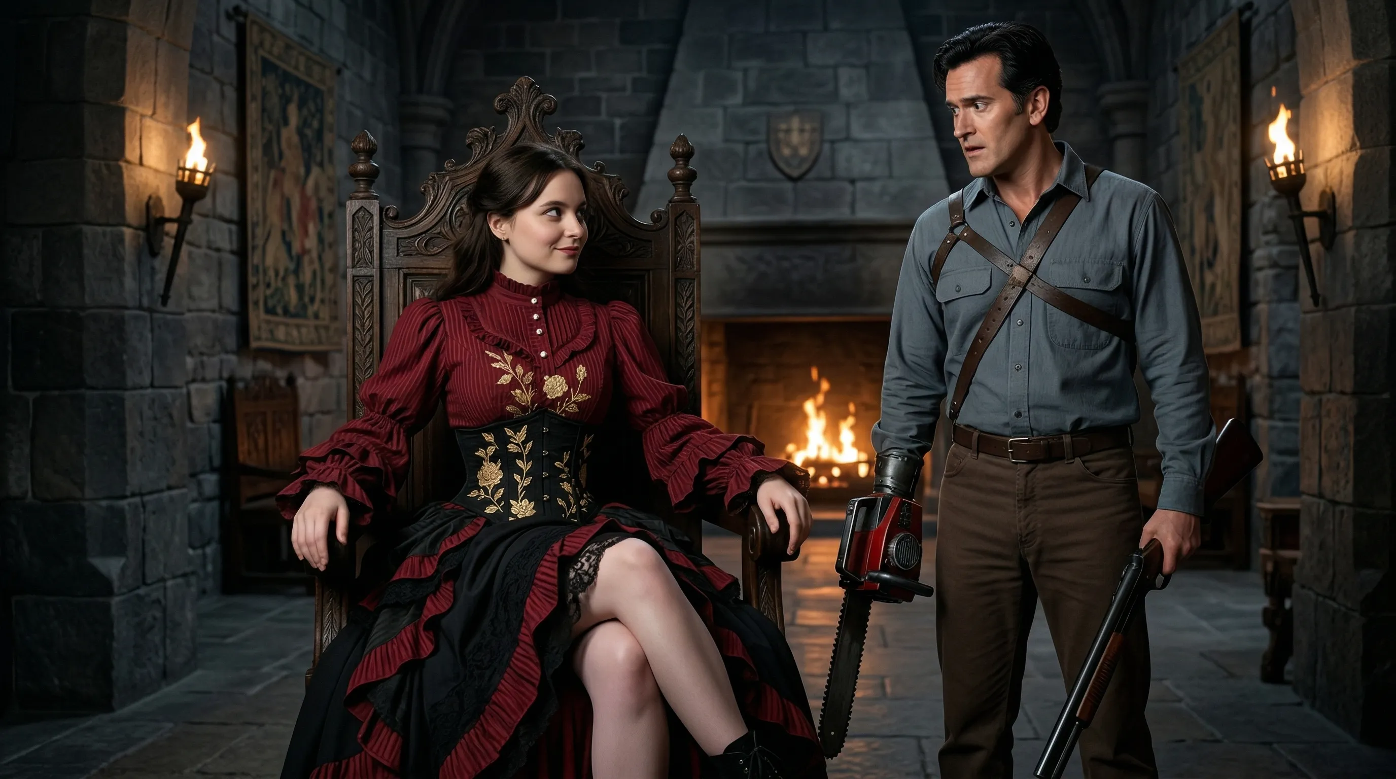 Put the dress to the girl.The girl in medieval dark red castle sitting in a chair with crossed legs posing and flerting to the young man.Remove the scar from man's right cheek please and make him clean
