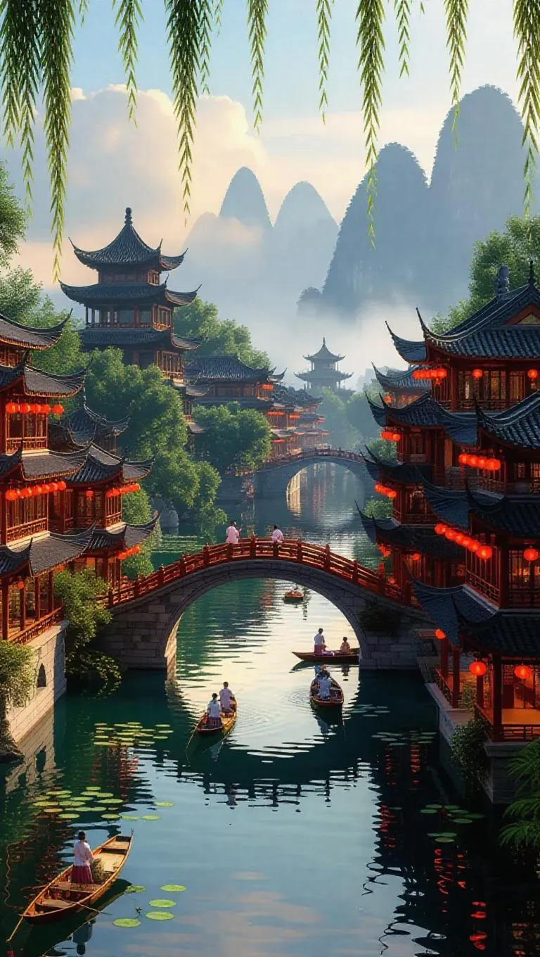 A grand riverside city in ancient China, bustling with silk-robed nobles, market stalls of pearls and jade, ten thousand layered rooftops beneath misty willow trees. Painted arch bridges span sparkling canals, fishermen and lotus girls laugh in boats under lantern-lit curtains. Golden osmanthus trees bloom by twin lakes, miles of lotus flowers sway. A poet, tipsy and smiling, stands on a pavilion, watching dancers and flutes under sunset clouds. Anime-style brilliance, flowing silk, shimmering water, dreamlike city lights.