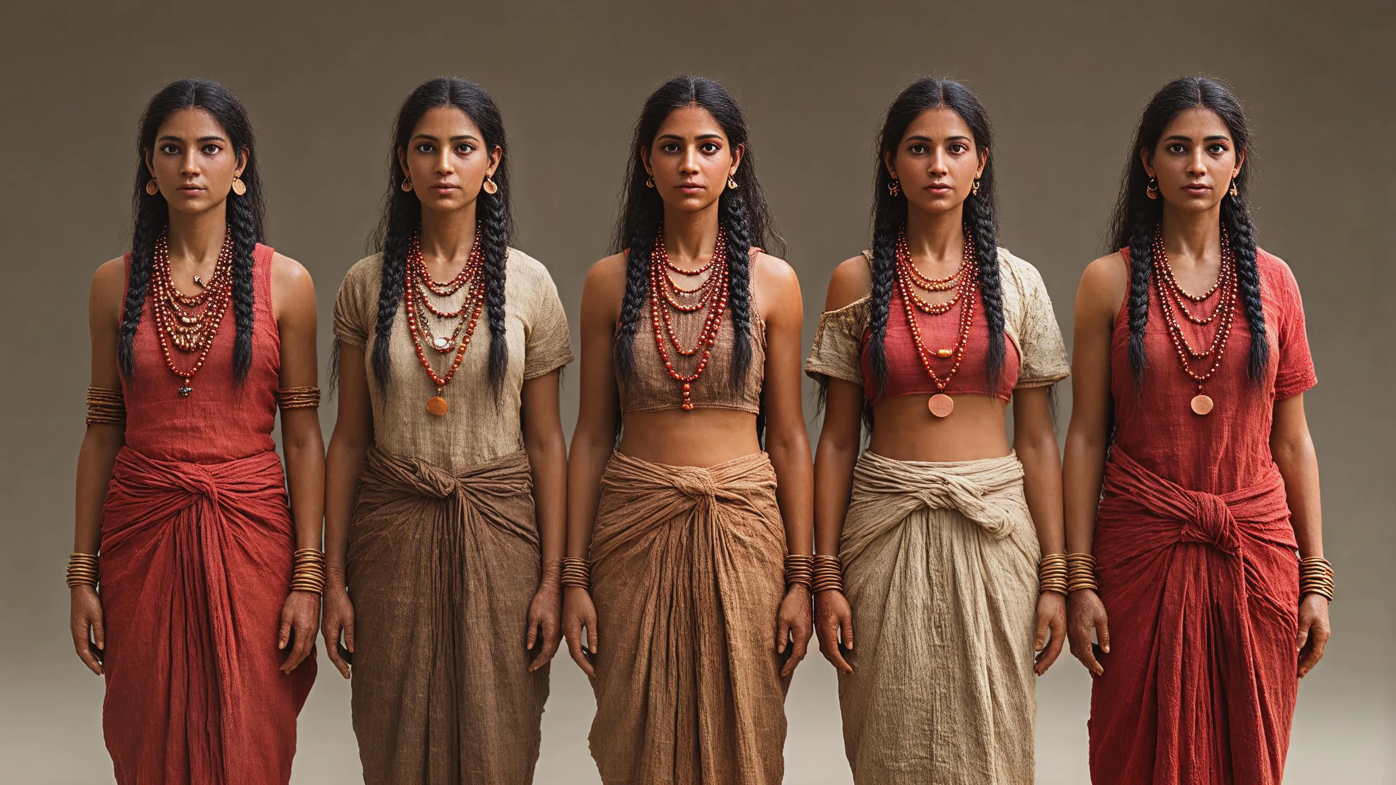 Ultra-photorealistic 8K still image of five identical Indus Valley women from Harappa/Mohenjo-Daro (2600–2000 BCE peak period), standing in perfect straight line formation facing viewer, authentic proto-Dravidian features (smooth medium-brown skin, dark almond-shaped eyes, straight black hair in long braids with shell ornaments, sturdy healthy builds). Stable, archaeologically accurate cotton clothing & confirmed accessories: Simple draped cotton lower garments (dhoti-style shorts to knees) in natural earth tones (ochre red, beige-brown, mud-red) Short upper body wraps/tunics showing shoulders/arms Terracotta bangles (Harappa finds), carnelian bead necklaces (6-8 etched beads), shell disc earrings, ivory combs Subtle kohl lining, minimal henna on hands Precise group positioning (left to right): Tallest: ochre red dhoti + beige wrap, largest carnelian necklace Medium: brown dhoti + red wrap, terracotta bangles both arms Center: beige dhoti + ochre wrap, double carnelian + shell strand Medium: red dhoti + brown wrap, single large shell earrings Shortest: mud-red dhoti + beige wrap, ivory comb in braid FOREGROUND – Authentic archaeological objects: 10+ unicorn seals (clay tablets w/ Indus script), cubical stone weights (1:2:4 system) Wheel-turned pottery (storage jars, cooking pots, toy bulls), etched carnelian bead piles Lapis lazuli chunks, small ivory tusks, copper razors/fishhooks DETAILED LIVELY BACKGROUND (50+ authentic Indus people – NO ONE completely naked): 15 MEN: medium-brown skin, short hair/turbans, dhoti loincloths + upper body wraps, carrying 20kg grain sacks, pushing wooden carts w/ pottery, grinding copper tools, weighing carnelian beads on stone scales 25 WOMEN: long braided hair, knee-length cotton skirts + shoulder wraps, grinding grain on saddle querns, spinning cotton at looms, filling water jars from brick wells w/ pulley ropes, carving conch shell bangles 12 CHILDREN (4-10yrs): small draped cloths/loincloths covering properly, playing w/ terracotta bulls/birds, mini wooden carts, clay whistles Potters spinning wheels (red pottery), perlenmacher drilling carnelian, farmers w/ wheat/cotton bundles, fishermen mending nets PHOTOREALISTIC SETTING – Mohenjo-Daro Great Bath (thriving): Golden hour through 1:2:4 brick arches, Great Bath (12×7m pool) w/ 10 bathers using copper dippers Active street drains flowing, courtyard houses (flat roofs), lush monsoon valley (wheat/cotton fields, flowing Indus) Egalitarian metropolis vibe – no kings/palaces, geometric streets bustling Ultra-photorealistic details: Skin pores/sweat sheen/dust on feet for ALL 55+ figures, cotton weave texture, brick mortar gaps Depth of field: razor-sharp dancers/objects, detailed populated background Warm golden monsoon lighting, physically correct shadows