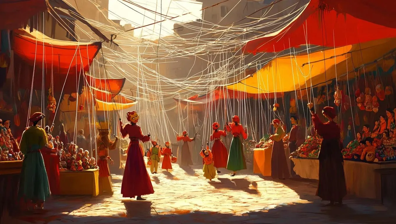 In a vibrant marketplace, puppet vendors and shoppers bustle with dynamic poses, their strings crisscrossing overhead in a intricate web. Warm hues of red, orange, and yellow enliven the scene, capturing the lively energy of the market. Soft, diffused sunlight filters through, casting gentle shadows and highlighting the colorful stalls and animated figures. The style is whimsical and detailed, blending realism with a touch of fantasy.