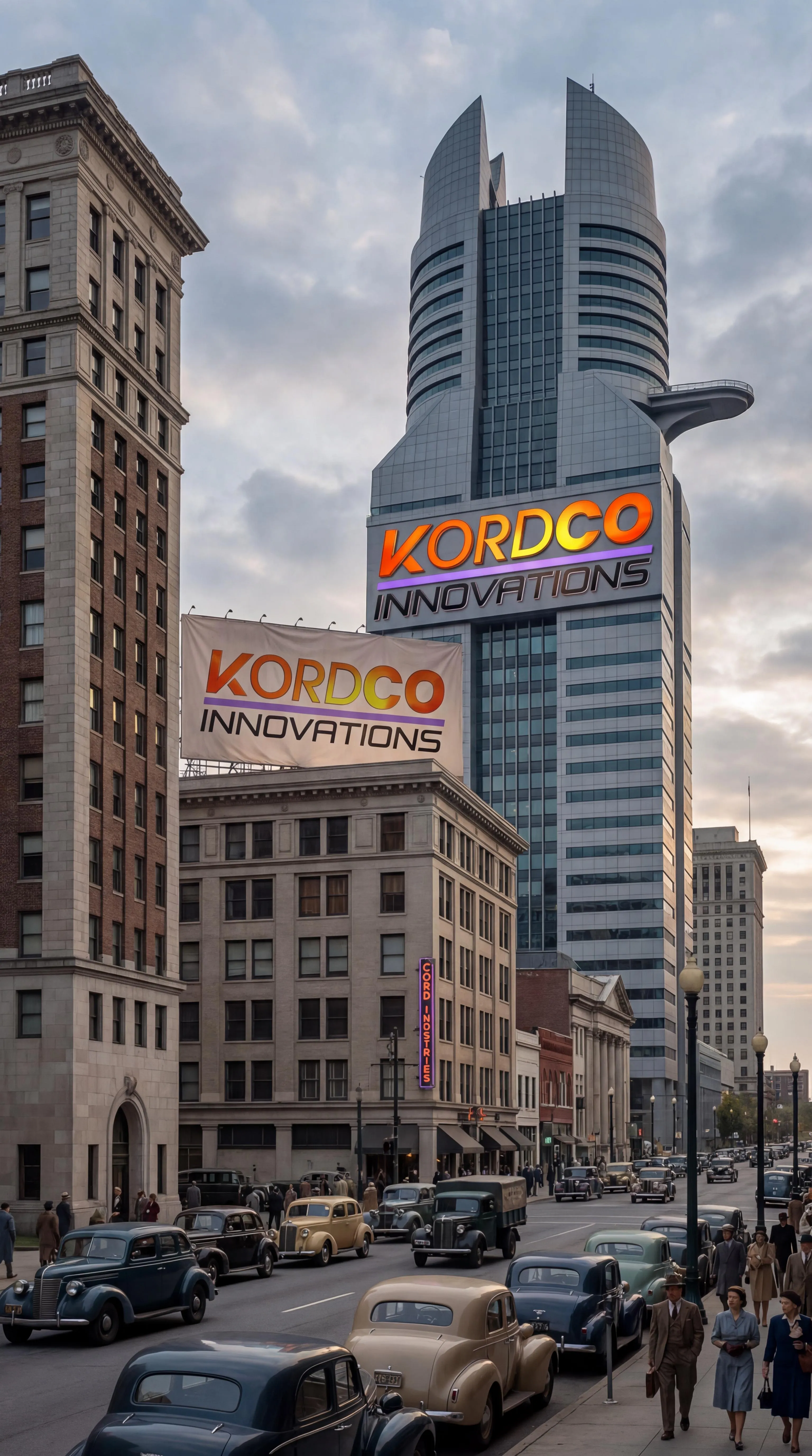 Transform text into AI-generated concept art: See the retrofitted Kord Tower from Blue Beetle (DCEU) featuring the Kordco Innovations logo in 1940s Metro Atlanta. The adjacent building displays a Kordco banner, while the neighboring LexCorp structure stands blank. Create unique cinematic scenes with vivago.ai.