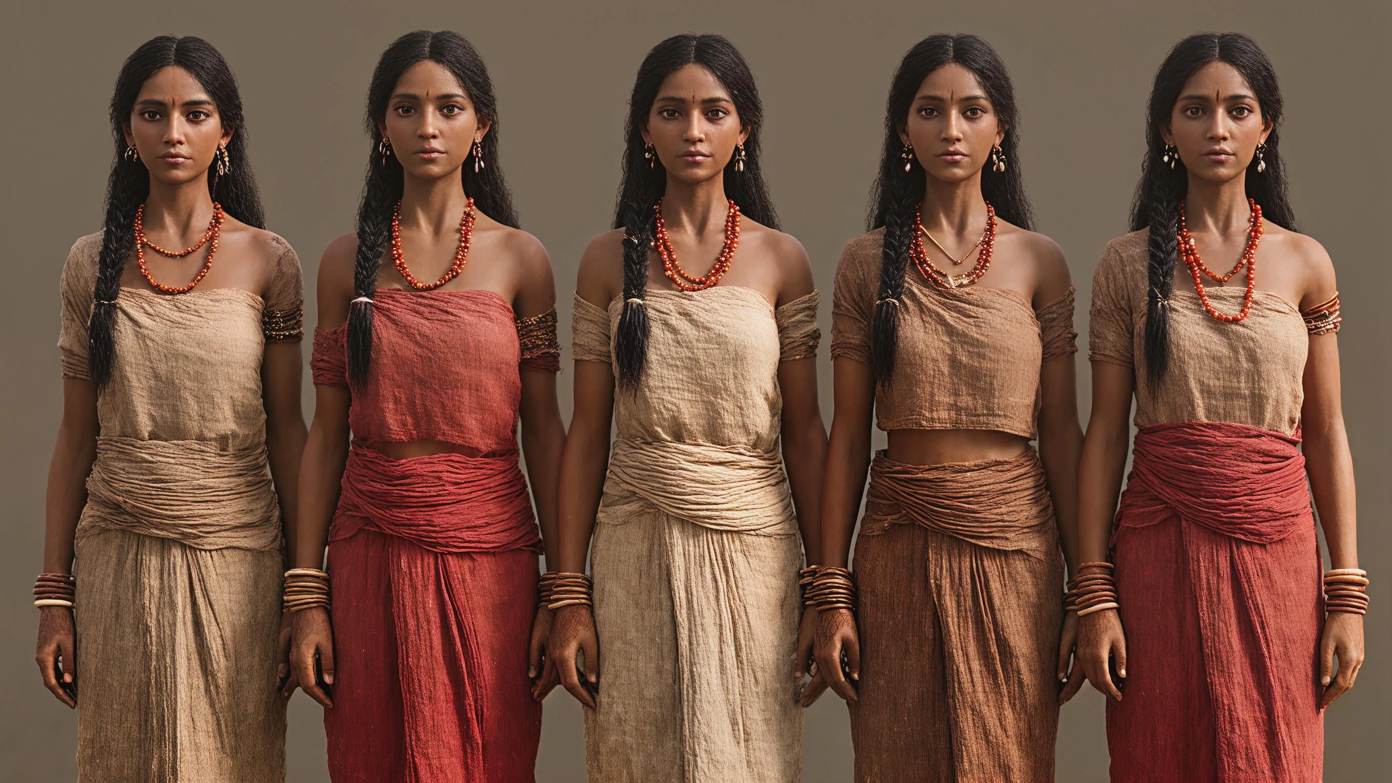 Ultra-photorealistic 8K still image of five identical Indus Valley women from Harappa/Mohenjo-Daro (2600–2000 BCE peak period), standing in perfect straight line formation facing viewer, authentic proto-Dravidian features (smooth medium-brown skin, dark almond-shaped eyes, straight black hair in long braids with shell ornaments, sturdy healthy builds). Stable, archaeologically accurate cotton clothing & confirmed accessories: Simple draped cotton lower garments (dhoti-style shorts to knees) in natural earth tones (ochre red, beige-brown, mud-red) Short upper body wraps/tunics showing shoulders/arms Terracotta bangles (Harappa finds), carnelian bead necklaces (6-8 etched beads), shell disc earrings, ivory combs Subtle kohl lining, minimal henna on hands Precise group positioning (left to right): Tallest: ochre red dhoti + beige wrap, largest carnelian necklace Medium: brown dhoti + red wrap, terracotta bangles both arms Center: beige dhoti + ochre wrap, double carnelian + shell strand Medium: red dhoti + brown wrap, single large shell earrings Shortest: mud-red dhoti + beige wrap, ivory comb in braid FOREGROUND – Authentic archaeological objects: 10+ unicorn seals (clay tablets w/ Indus script), cubical stone weights (1:2:4 system) Wheel-turned pottery (storage jars, cooking pots, toy bulls), etched carnelian bead piles Lapis lazuli chunks, small ivory tusks, copper razors/fishhooks DETAILED LIVELY BACKGROUND (50+ authentic Indus people – NO ONE completely naked): 15 MEN: medium-brown skin, short hair/turbans, dhoti loincloths + upper body wraps, carrying 20kg grain sacks, pushing wooden carts w/ pottery, grinding copper tools, weighing carnelian beads on stone scales 25 WOMEN: long braided hair, knee-length cotton skirts + shoulder wraps, grinding grain on saddle querns, spinning cotton at looms, filling water jars from brick wells w/ pulley ropes, carving conch shell bangles 12 CHILDREN (4-10yrs): small draped cloths/loincloths covering properly, playing w/ terracotta bulls/birds, mini wooden carts, clay whistles Potters spinning wheels (red pottery), perlenmacher drilling carnelian, farmers w/ wheat/cotton bundles, fishermen mending nets PHOTOREALISTIC SETTING – Mohenjo-Daro Great Bath (thriving): Golden hour through 1:2:4 brick arches, Great Bath (12×7m pool) w/ 10 bathers using copper dippers Active street drains flowing, courtyard houses (flat roofs), lush monsoon valley (wheat/cotton fields, flowing Indus) Egalitarian metropolis vibe – no kings/palaces, geometric streets bustling Ultra-photorealistic details: Skin pores/sweat sheen/dust on feet for ALL 55+ figures, cotton weave texture, brick mortar gaps Depth of field: razor-sharp dancers/objects, detailed populated background Warm golden monsoon lighting, physically correct shadows