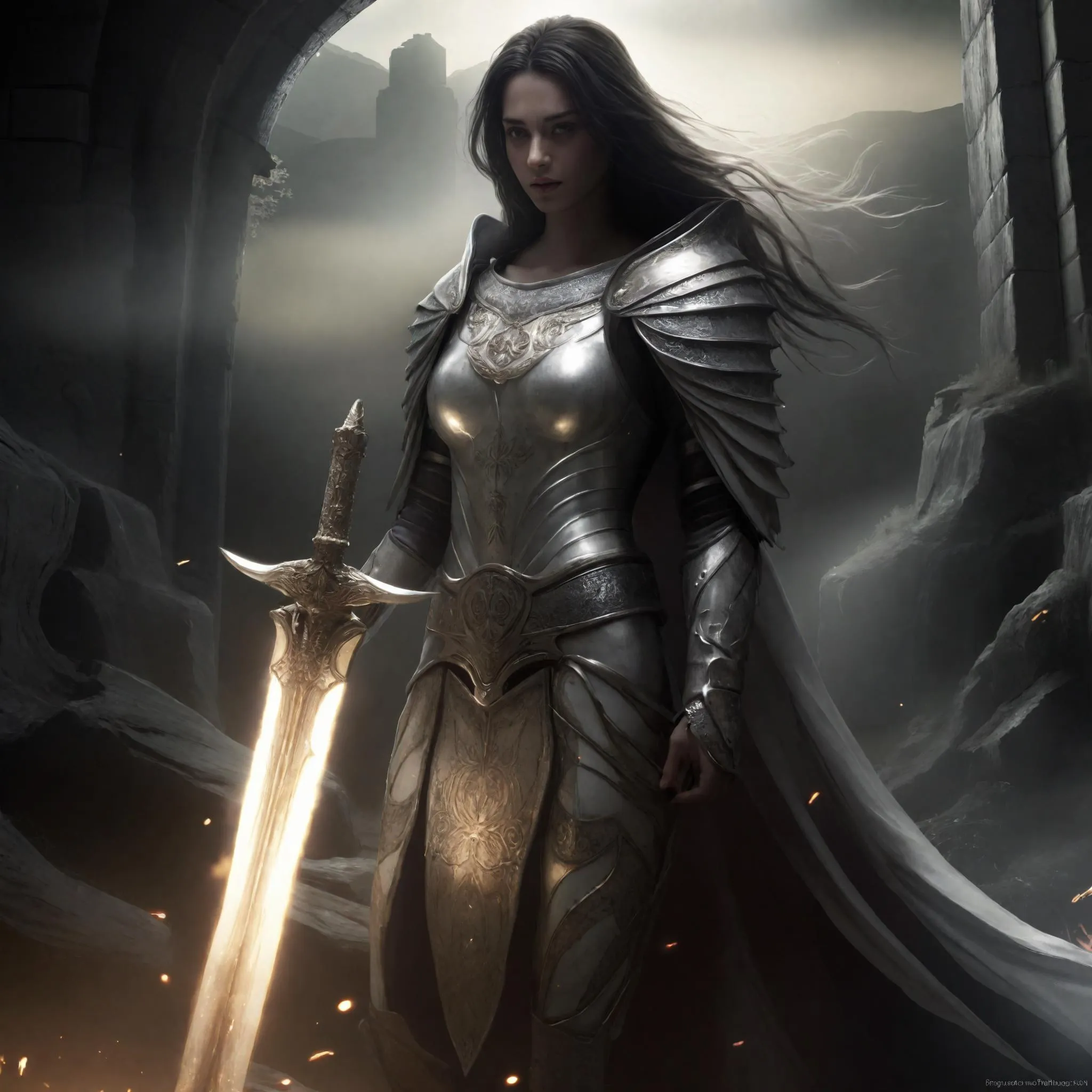 Shimmering white armor, intricately designed with gold accents, reflecting a soft glow from ambient light, set against a backdrop of ancient stone walls and flickering torches, exuding a sense of noble valor and timeless strength.