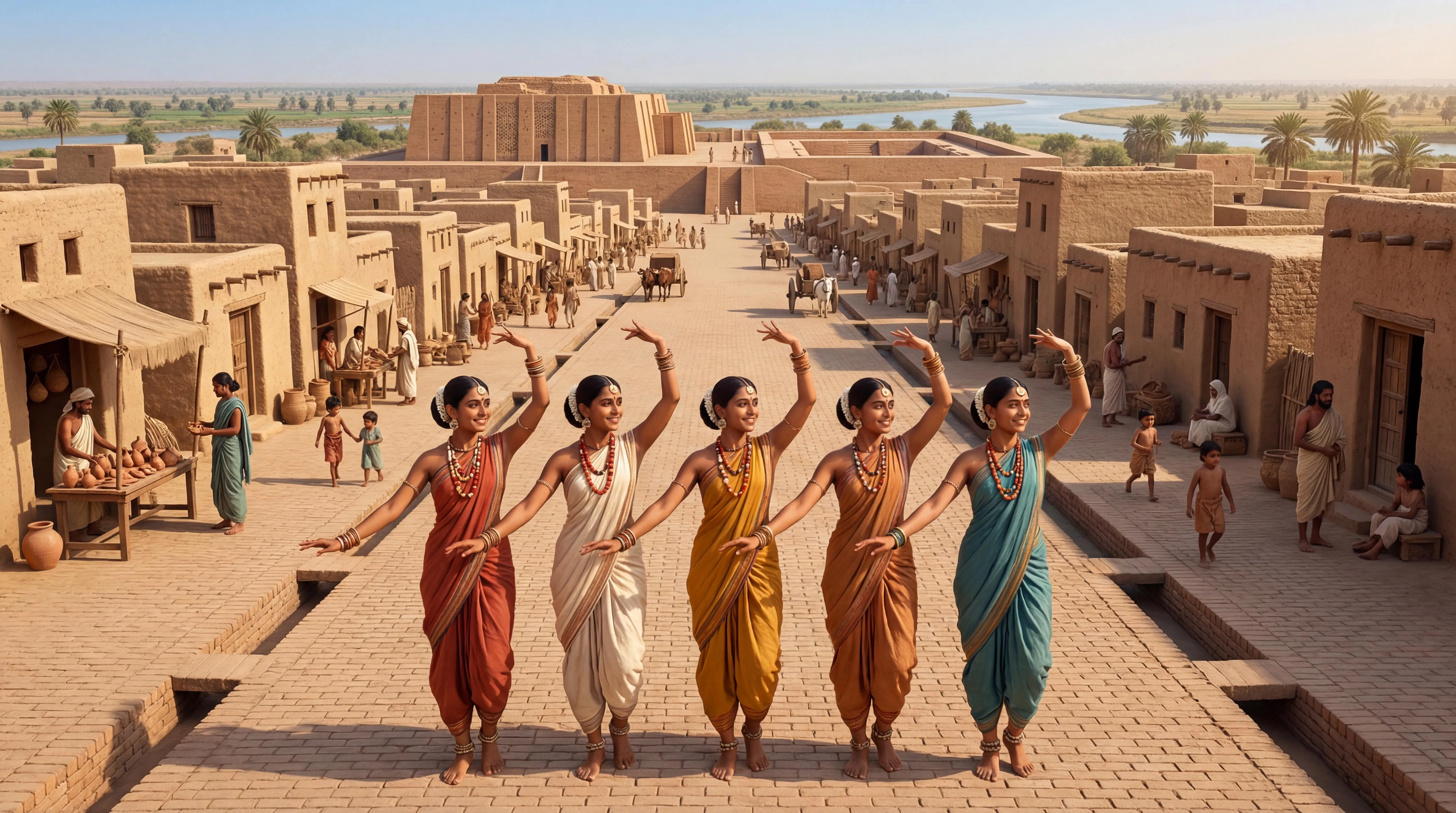 Photorealistic scene of a bustling Indus Valley Civilization city like Mohenjo-Daro or Harappa at its peak around 2600 BCE, vibrant daytime under clear blue sky with Indus River in distant background, fertile plains and palm trees. Foreground: Five beautiful young women standing in a perfect straight line on a wide brick-paved street (10m broad, straight north-south axis), fully visible from head to toe, poised and ready to dance with joyful expressions, arms gracefully raised in synchronized pose. They wear authentic lightweight cotton draped garments (long shawls over one shoulder, ankle-length skirts/dhotis) in earthy terracotta red, off-white, ochre yellow, and subtle blue-green dyes; adorned with large colorful beaded necklaces (carnelian, agate, shell beads), bangles, anklets, nose rings, and hair buns with shell combs – no modern elements, historically accurate Dravidian features, smooth brown skin, long dark hair. Background: Thriving non-ruined city with precise orthogonal grid street layout (right angles, rounded corners for carts), uniform multi-story baked-brick houses (standard bricks 28x14x7cm, 1-2 stories high, flat roofs accessed by external stairs, deep central courtyards for light/ventilation, minimal street-facing windows, wooden door frames), elevated Citadel mound with massive granary platform (50x50m ventilated shafts) and nearby Great Bath (12x7m rectangular pool, 2.4m deep, bitumen waterproofed, flanked by changing rooms and stepped access ramps), market stalls with clay seals, advanced covered brick drains (1m wide with inspection holes) lining every street, people in period clothing (men in simple kilts/dhotis carrying pottery or baskets, women in shawls with jewelry trading goods), ox-carts, children playing, overall lively urban atmosphere. Highly detailed, authentic archaeology-based reconstruction, warm sunlight, high resolution, no anachronisms, cinematic composition focusing on the women line against the cityscape.