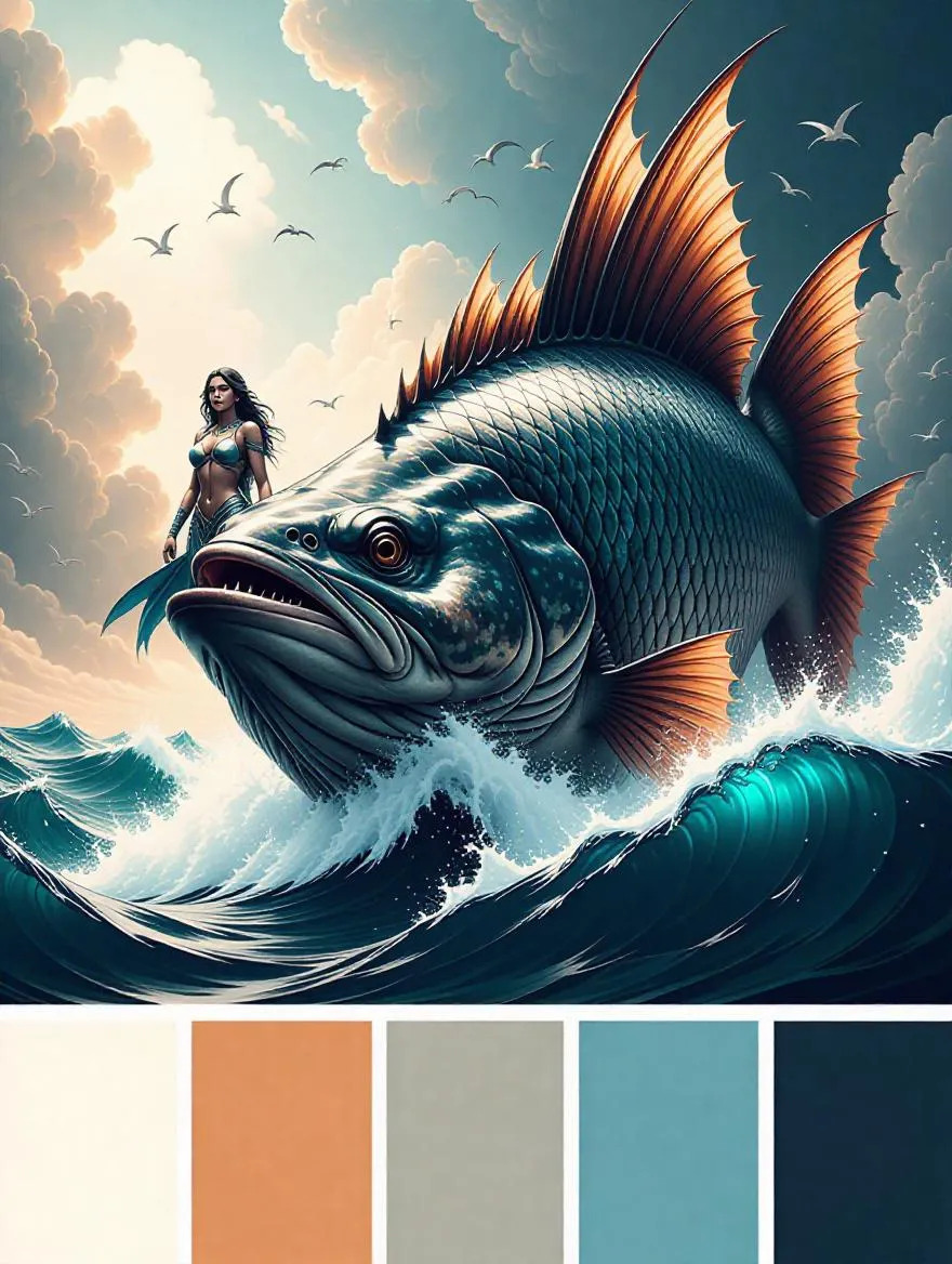 Goddesses of destruction big fish with light-brown-gray dark-gray deep-blue and white color palette