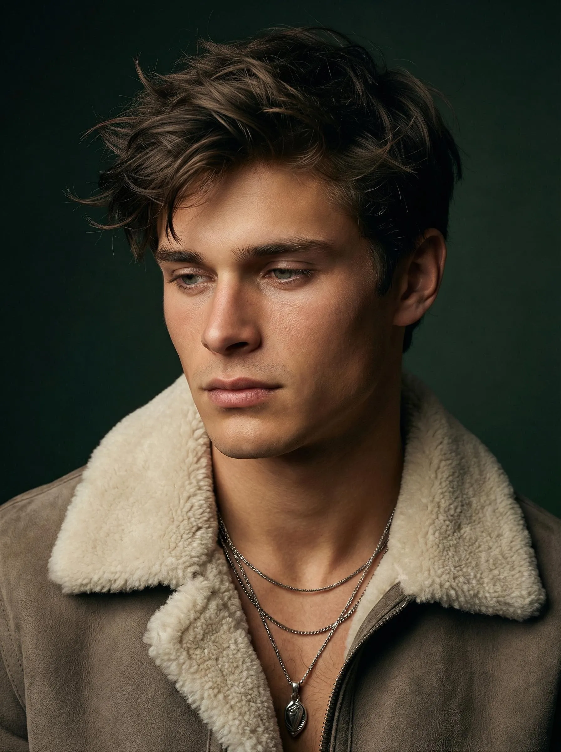 Generate photorealistic portraits matching uploaded images exactly with vivago.ai's AI tools. Create detailed close-ups featuring messy wind-tousled hair, taupe suede shearling jackets, layered necklaces, and moody dark green backdrops. Achieve cinematic lighting, shallow depth of field, and ultra-detailed 8K fashion photography—commercial-ready with no watermarks.