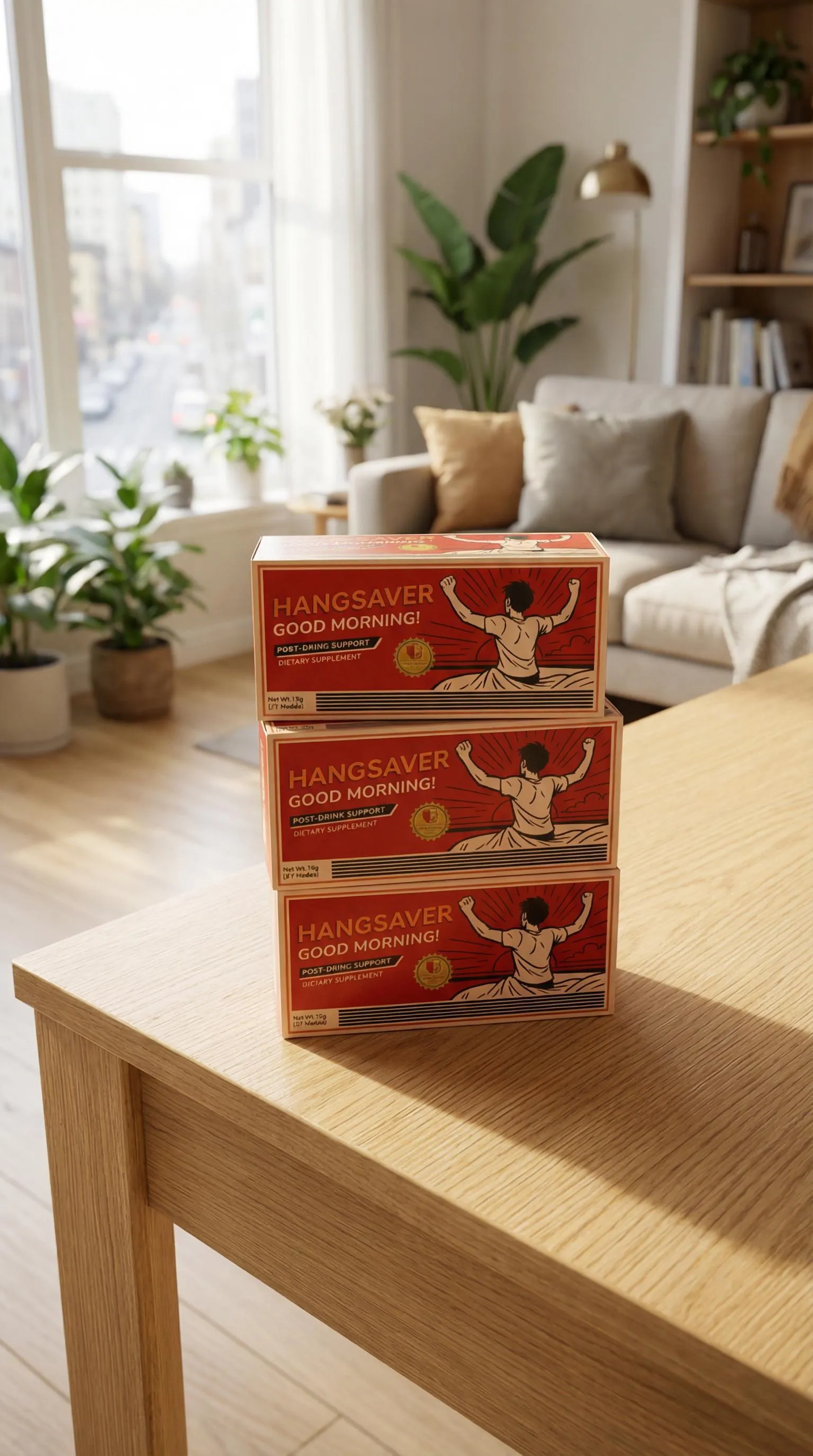 Generate AI images with vivago.ai: Transform text prompts into professional visuals. Create a scene of three packaging boxes on a table in a European-American woman's solo apartment, featuring foreground focus, soft natural light, and a fresh, comfortable style. Ideal for AI effects and creative content.