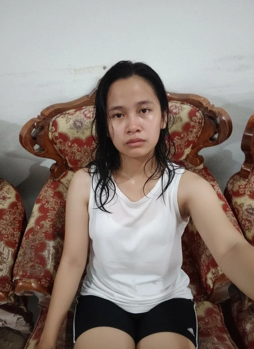 Create realistic AI-generated selfie of exhausted woman in sweaty white singlet & black shorts. Close-up emotional portrait showing messy hair, tired & sad expression, visible sweat on skin and damp clothing. Authentic AI image tool for raw human moments.