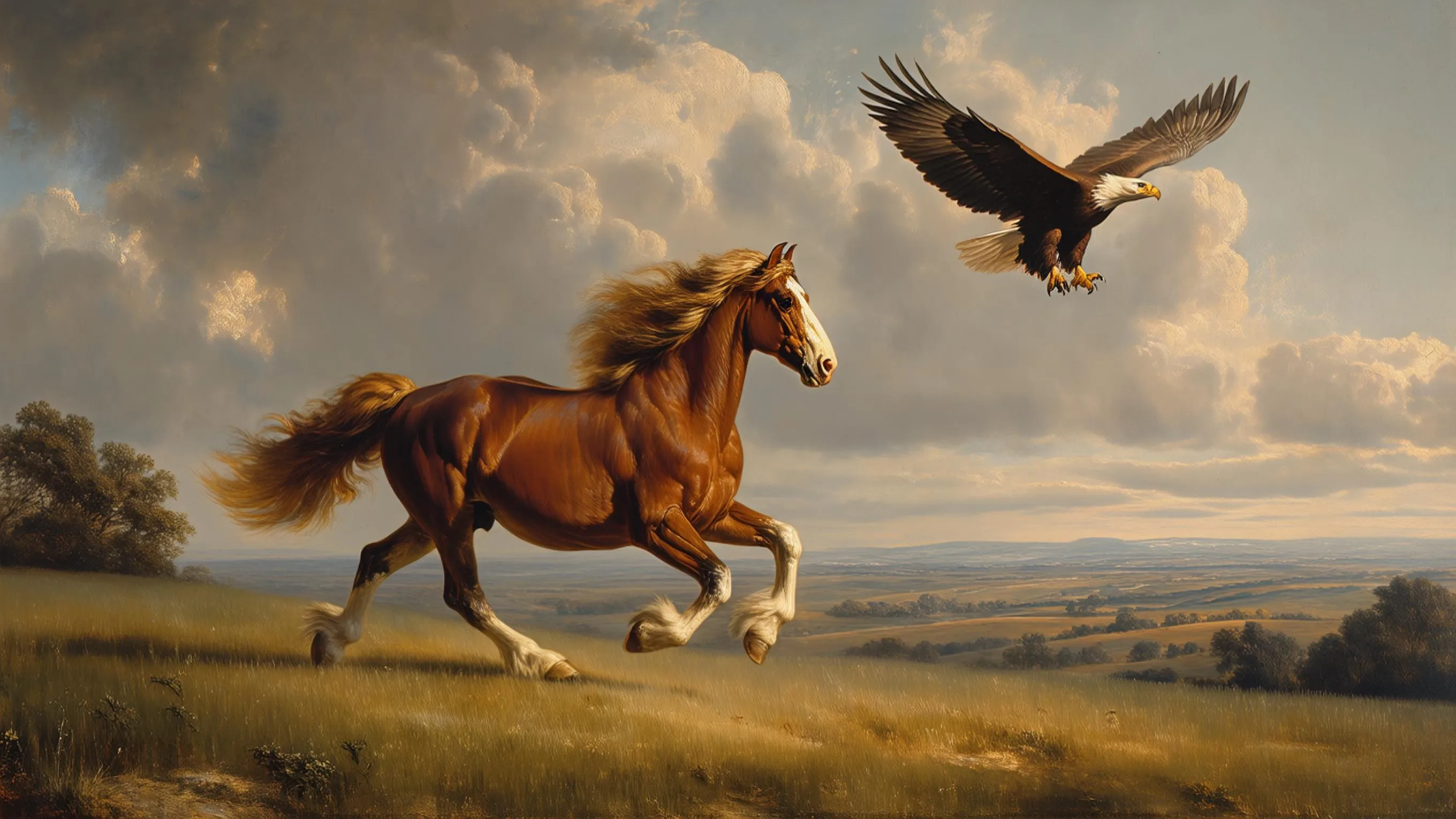Create majestic Baroque-era AI art: a powerful Clydesdale horse running through open fields, feathered hooves detailed, alongside a soaring eagle symbolizing freedom. Features chiaroscuro lighting, warm earth tones, and dramatic Baroque clouds. Generate this 17th-century oil painting masterpiece with panoramic realism using AI. Timeless composition evoking strength.