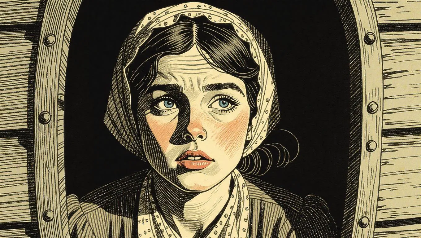 Generate an AI image of a young poor French woman inside a 19th-century Paris slum stagecoach, rendered in Emil Ferris's colorized ballpoint style mixed with Tim Burton gothic art, Hengdian painting, and Arcimboldo surrealism for sharp, unreal 8K comic book results using Vivago.ai.