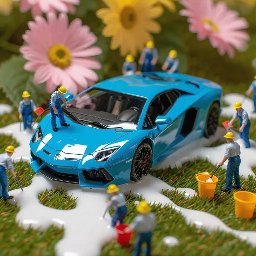 A group of tiny, thumb-sized workers is diligently cleaning a gorgeous, electric blue sports car, which is the centerpiece of the image. The car is parked on a grass-covered surface, and has white splatters on its side, indicating that it has been recently washed or sprayed. The miniature workers are scattered around the car, some standing closer to it while others are further away. They appear to be focused on their task, using tiny mops and buckets to scrub and rinse the vehicle. The surrounding environment is dominated by a soft, pastel sky, which casts an inviting light over the scene. There are no other objects or people visible in the image, and no text or distinctive markings are present.