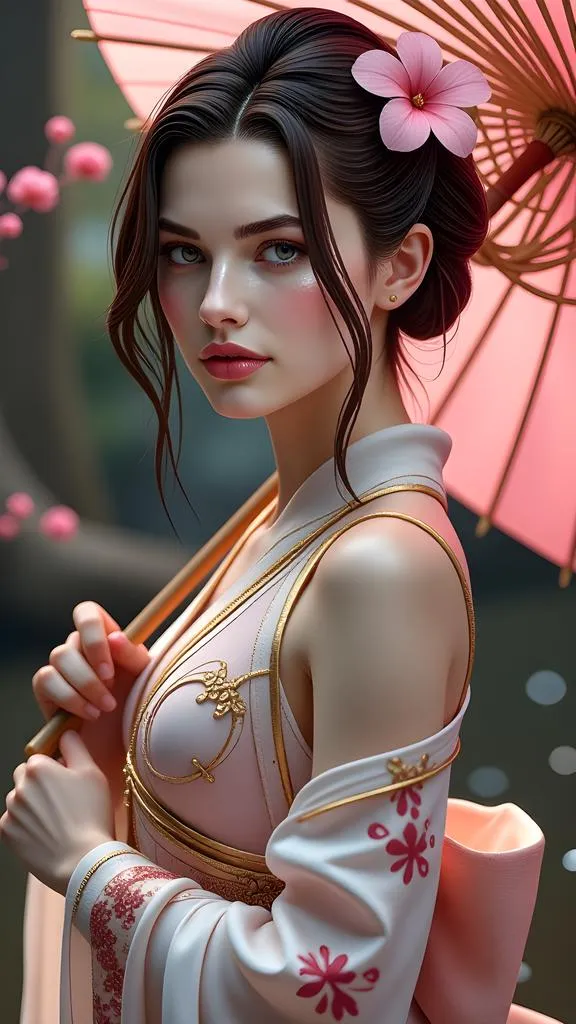 Cyberpunk geisha goddess blends traditional Japanese makeup with futuristic biomechanical details. Neon highlights illuminate metallic implants, glowing circuits, and a translucent pink glow. Ethereal smoke painting art style enhances the misty, rain-soaked atmosphere, dynamic lighting, and refined digital artistry. Explore seamless fusion of cultural elegance and cyberpunk innovation in this AI-generated masterpiece.