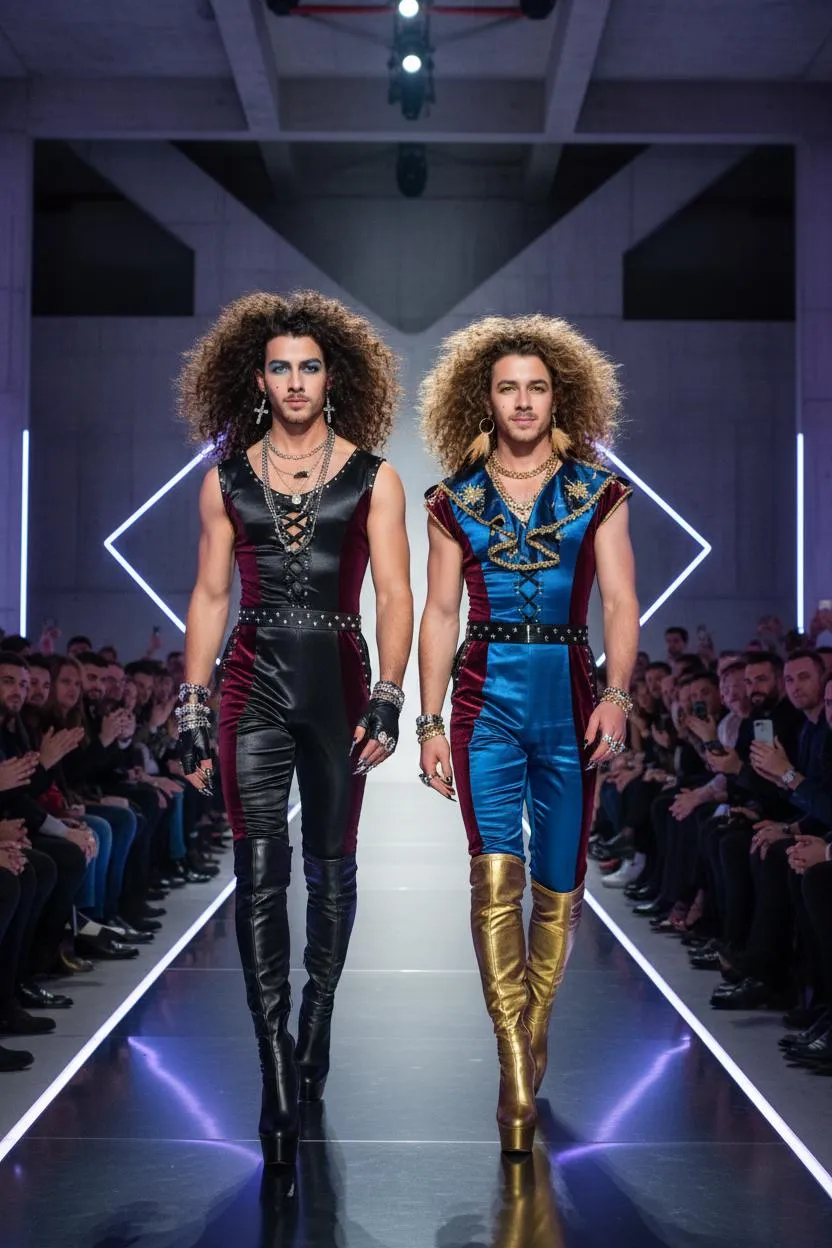 Generate AI images of Joe and Nick Jonas transformed for a Gay Men's Fashion Week runway. Picture them in Adam Ant-inspired New Romantic skintight satin/velvet outfits, stiletto boots, glam makeup, & bold jewelry. The setting? A brutalist futuristic ballroom. Create stunning, gender-fluid glam looks with Vivago.ai's AI image generation tool.