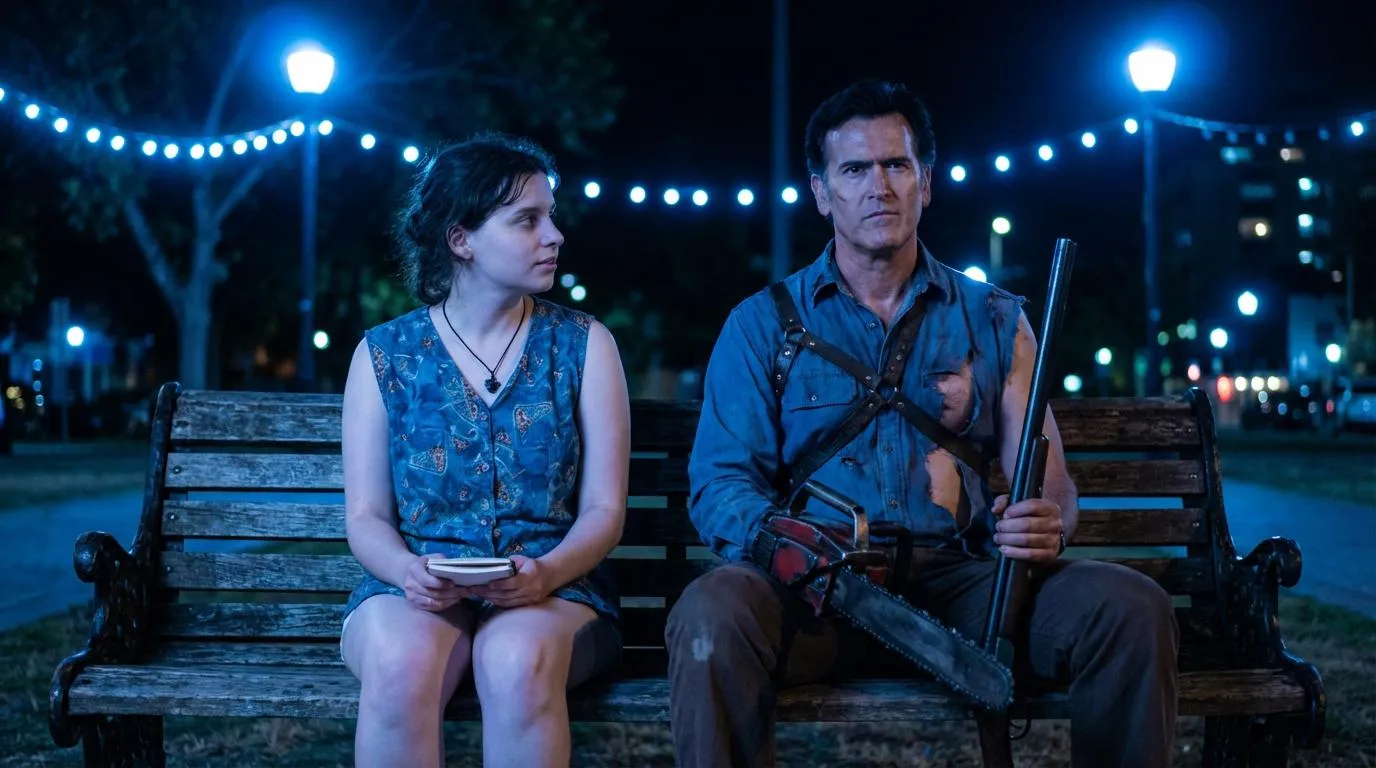 Create custom AI images with you and Ash Williams on a night-time bench. Generate supernatural scenes featuring blue lighting effects. Perfect for horror fans and personalized pop-culture art. Try our AI image generator for unique character insertions and atmospheric visuals.