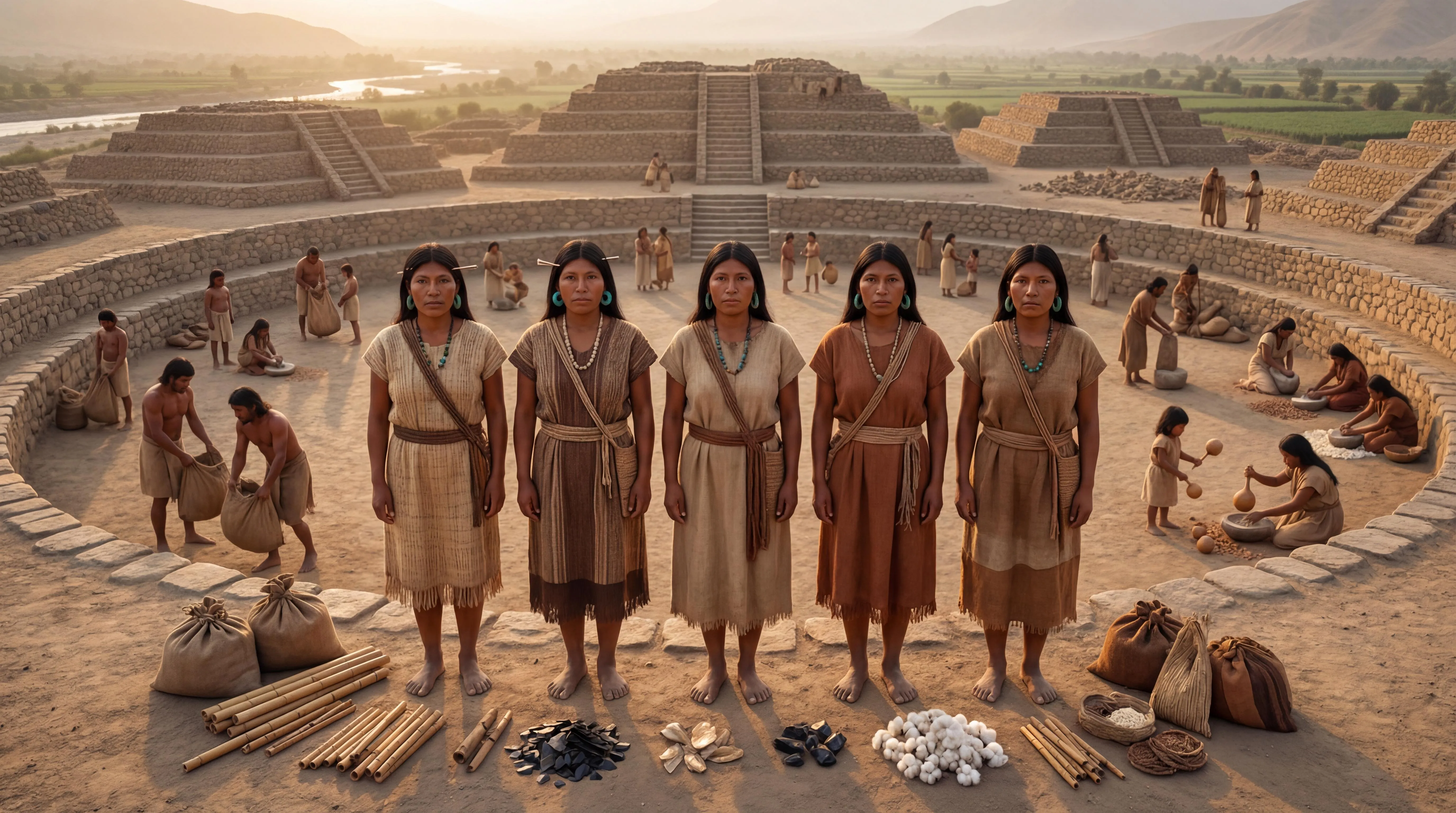 Caral-Supe Civilization – Ultra Photorealistic FULL-BODY IMAGE (Women Completely Inside Frame) Ultra-photorealistic 8K full-body image of five beautiful women from the ancient Caral-Supe civilization (Sacred City of Caral, Peru, c. 2500–1800 BCE), all completely visible from head to toes within the image frame with no body parts outside or cut off by edges, standing in a perfect straight line facing the viewer at the upper edge of the main sunken circular plaza. Show authentic early Andean / Norte Chico features: copper-brown skin, straight black hair, high cheekbones, dark expressive eyes, sturdy but elegant builds. All five women entirely contained within frame boundaries, bare feet clearly visible on dusty plaza floor. They wear archaeologically plausible organic-fiber clothing: woven reed or grass skirts reaching mid-calf in natural beige and brown tones, narrow llama-wool chest bands or simple reed shawls covering the chest, no modern tailoring. Over their shoulders hang visible quipu cords (knotted counting strings) in natural fiber colors. Jewelry is simple and ancient: stone and quartz bead necklaces, small shell elements, llama bone hairpins in their hair, and turquoise-style ear spools – all attached physically and not changing or growing. Each woman has a slightly different combination of skirt tone, band or shawl, necklace and hair ornament, but everything stays within a realistic, natural color palette. Around their feet in the foreground lie authentic Caral-Supe objects: several quipu bundles neatly coiled, reed flutes and simple bone flutes, piles of raw cotton bolls, llama bone tools, obsidian blade flakes, and a few shicra bags (woven reed bags filled with stones used in pyramid construction). All objects look used and functional, not decorative props. The background is a lively, fully populated Caral scene with more than 50 people from the same epoch. In and around the sunken Plaza Mayor behind the women, show about 15 men in reed skirts and shawls hauling heavy shicra bags, carrying small llama offerings and arranging construction stones; about 25 women in grass skirts and chest bands grinding cotton seeds on stone manos and metates, weaving reed baskets, and filling gourd water vessels; around 12 children in small reed cloths playing with cotton-boll toys, tiny quipu cords, and reed whistles. Place a group of musicians blowing bone flutes near the plaza steps, and a few workers higher up on the platforms. Surround the plaza with the characteristic Caral architecture: six low, earthen platform pyramids faced with stone (especially the Pirámide Mayor), circular stone amphitheater structures, and a few reed-thatched elite residences on the terraces. In the far background, show the dry coastal desert plateau dropping down to a green Supe River valley with irrigated cotton and squash fields and a winding river. Lighting is warm golden hour just before sunset, with long soft shadows, slight dust haze in the air, and physically accurate shading on skin, reeds, and stone. Style is ultra-photorealistic: detailed pores and slight sunburn on all visible skin, clear reed weave and llama-wool texture, dust on the women's feet, sharp focus on the five full-body women and foreground objects, slightly softer but still detailed background. All women completely inside frame boundaries with no limbs, hair, or feet extending beyond image edges.