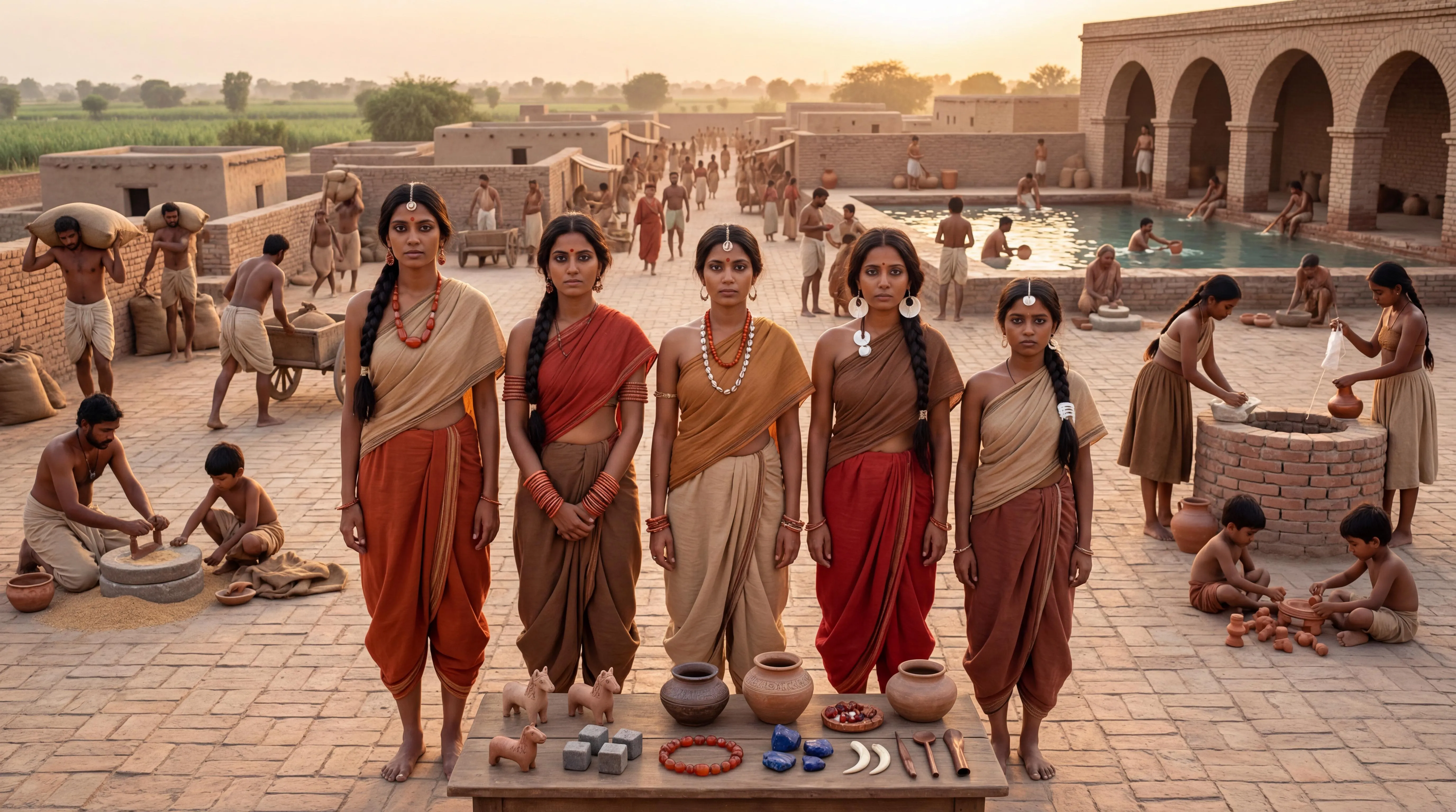 Indus Valley Harappa Culture – Ultra Photorealistic IMAGE (Complete w/ Detailed Background People) Ultra-photorealistic 8K still image of five identical Indus Valley women from Harappa/Mohenjo-Daro (2600–2000 BCE peak period), standing in perfect straight line formation facing viewer, authentic proto-Dravidian features (smooth medium-brown skin, dark almond-shaped eyes, straight black hair in long braids with shell ornaments, sturdy healthy builds). Stable, archaeologically accurate cotton clothing & confirmed accessories: Simple draped cotton lower garments (dhoti-style shorts to knees) in natural earth tones (ochre red, beige-brown, mud-red) Short upper body wraps/tunics showing shoulders/arms Terracotta bangles (Harappa finds), carnelian bead necklaces (6-8 etched beads), shell disc earrings, ivory combs Subtle kohl lining, minimal henna on hands Precise group positioning (left to right): Tallest: ochre red dhoti + beige wrap, largest carnelian necklace Medium: brown dhoti + red wrap, terracotta bangles both arms Center: beige dhoti + ochre wrap, double carnelian + shell strand Medium: red dhoti + brown wrap, single large shell earrings Shortest: mud-red dhoti + beige wrap, ivory comb in braid FOREGROUND – Authentic archaeological objects: 10+ unicorn seals (clay tablets w/ Indus script), cubical stone weights (1:2:4 system) Wheel-turned pottery (storage jars, cooking pots, toy bulls), etched carnelian bead piles Lapis lazuli chunks, small ivory tusks, copper razors/fishhooks DETAILED LIVELY BACKGROUND (50+ authentic Indus people): 15 MEN: medium-brown skin, short hair/turbans, dhoti loincloths, carrying 20kg grain sacks, pushing wooden carts w/ pottery, grinding copper tools, weighing carnelian beads on stone scales 25 WOMEN: long braided hair, knee-length cotton skirts + wraps, grinding grain on saddle querns, spinning cotton at looms, filling water jars from brick wells w/ pulley ropes, carving conch shell bangles 12 CHILDREN (4-10yrs): minimal cloths, playing w/ terracotta bulls/birds, mini wooden carts, clay whistles Potters spinning wheels (red pottery), perlenmacher drilling carnelian, farmers w/ wheat/cotton bundles, fishermen mending nets PHOTOREALISTIC SETTING – Mohenjo-Daro Great Bath (thriving): Golden hour through 1:2:4 brick arches, Great Bath (12×7m pool) w/ 10 bathers using copper dippers Active street drains flowing, courtyard houses (flat roofs), lush monsoon valley (wheat/cotton fields, flowing Indus) Egalitarian metropolis vibe – no kings/palaces, geometric streets bustling Ultra-photorealistic details: Skin pores/sweat sheen/dust on feet for ALL 55+ figures, cotton weave texture, brick mortar gaps Depth of field: razor-sharp dancers/objects, detailed populated background Warm golden monsoon lighting, physically correct shadows