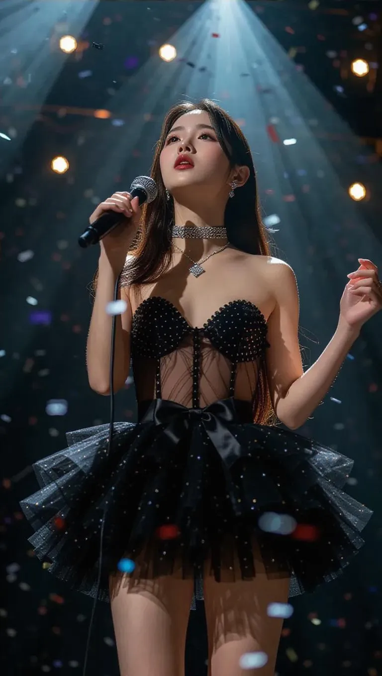 Generate hyper-realistic AI portraits of glamorous singers. Vivago.ai crafts ultra-low angle, close-up shots with high-end textures. Features: fair-skinned girl in black sequin puffy skirt, diamond-accented accessories, broken microphone, dynamic spotlights & drifting confetti. Perfect for 3D hyper-realistic rendering & professional portrait photography.