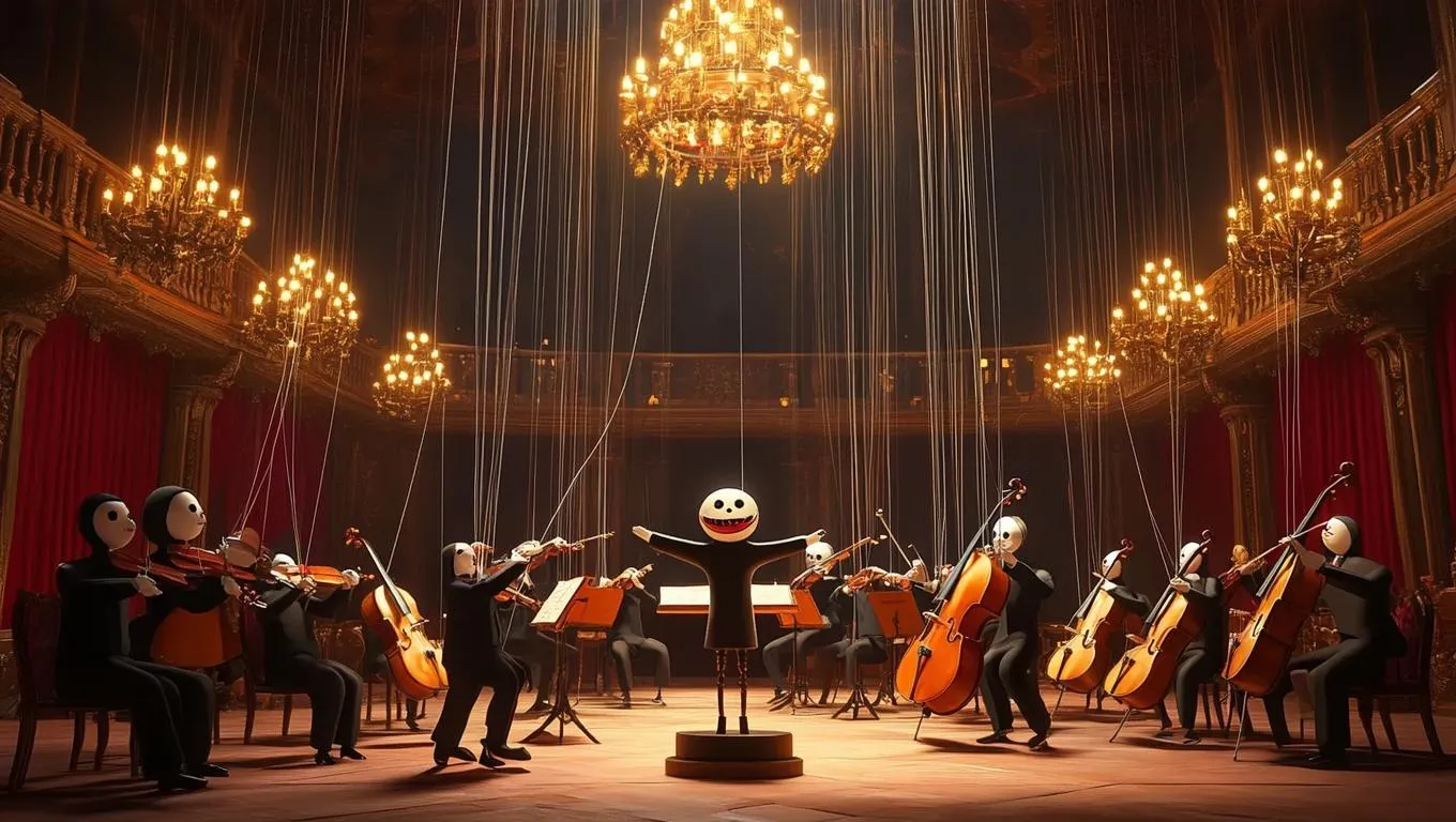 In a grand hall, a puppet orchestra performs, each musician's strings leading to a single conductor puppet, whose strings vanish into the rafters. Richly detailed musical instruments fill the stage, from violins and cellos to flutes and timpani. The hall is adorned with ornate chandeliers and plush red curtains, casting a warm, ambient glow. Soft, diffused side lighting enhances the textures of the puppets and instruments, creating a serene and magical atmosphere. The style is realistic, with a touch of whimsical fantasy.