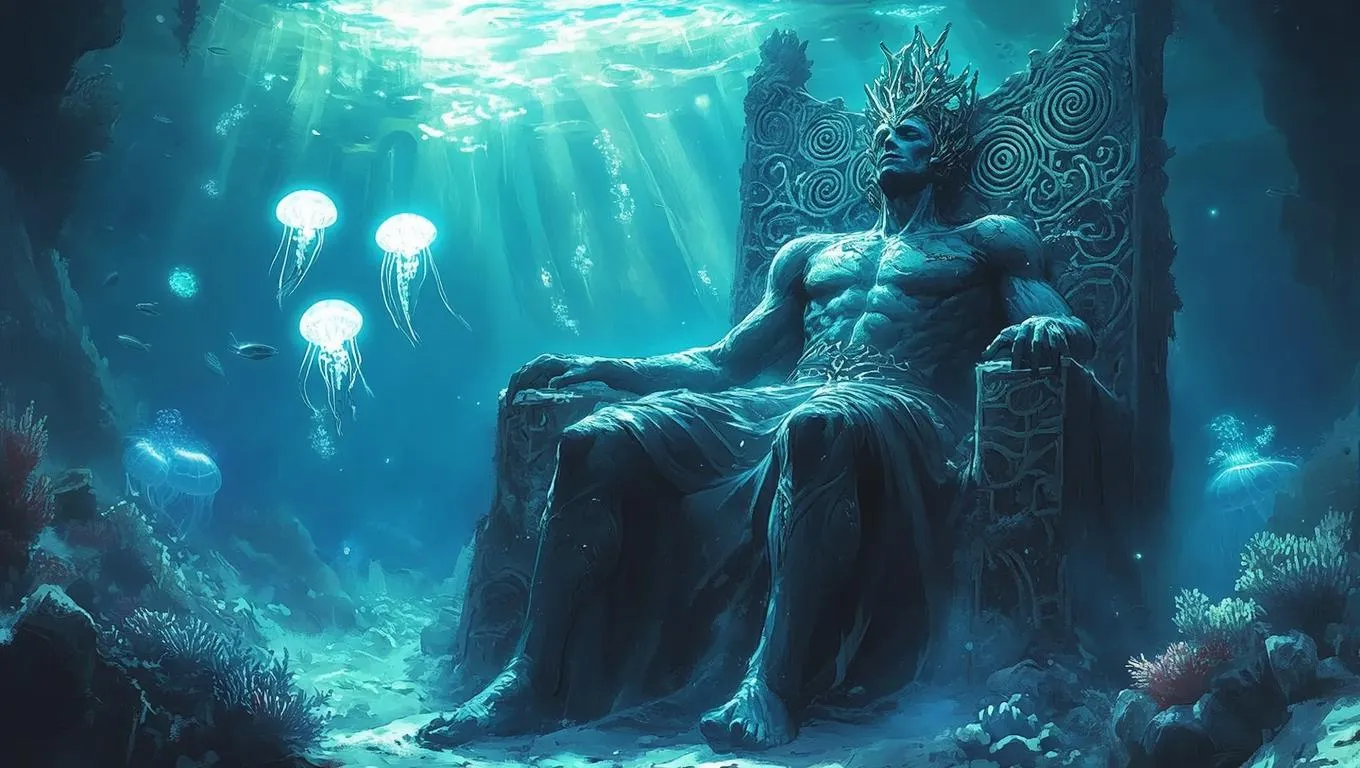 Create AI-generated anime art with Vivago.ai's cinematic underwater scene of mythical sea god Iyune. Featuring bioluminescent fish, coral throne, and Ghibli-inspired watercolor visuals. Transform text into tranquil, mythic AI art with steely blue tones and sacred glyphs. Perfect for anime and cinematic storytelling.