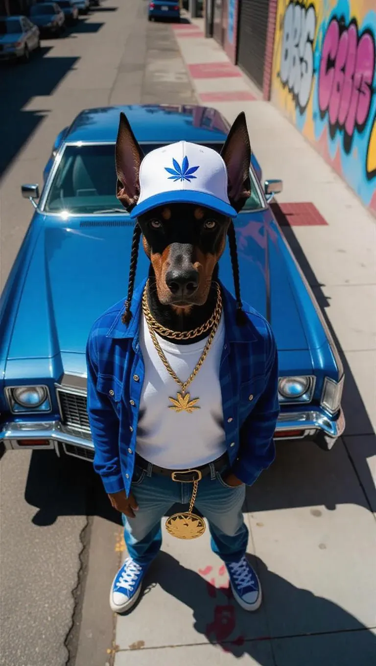 Create striking AI images of an anthropomorphic Doberman wearing streetwear – gold chain with pot leaf, LA cap, blue flannel – posed by a vintage Cadillac on graffiti-filled Compton streets. Vivid shadows & highlights. Generate this unique urban character illustration instantly with Vivago.ai's AI image tools. Professional 4K HD quality.