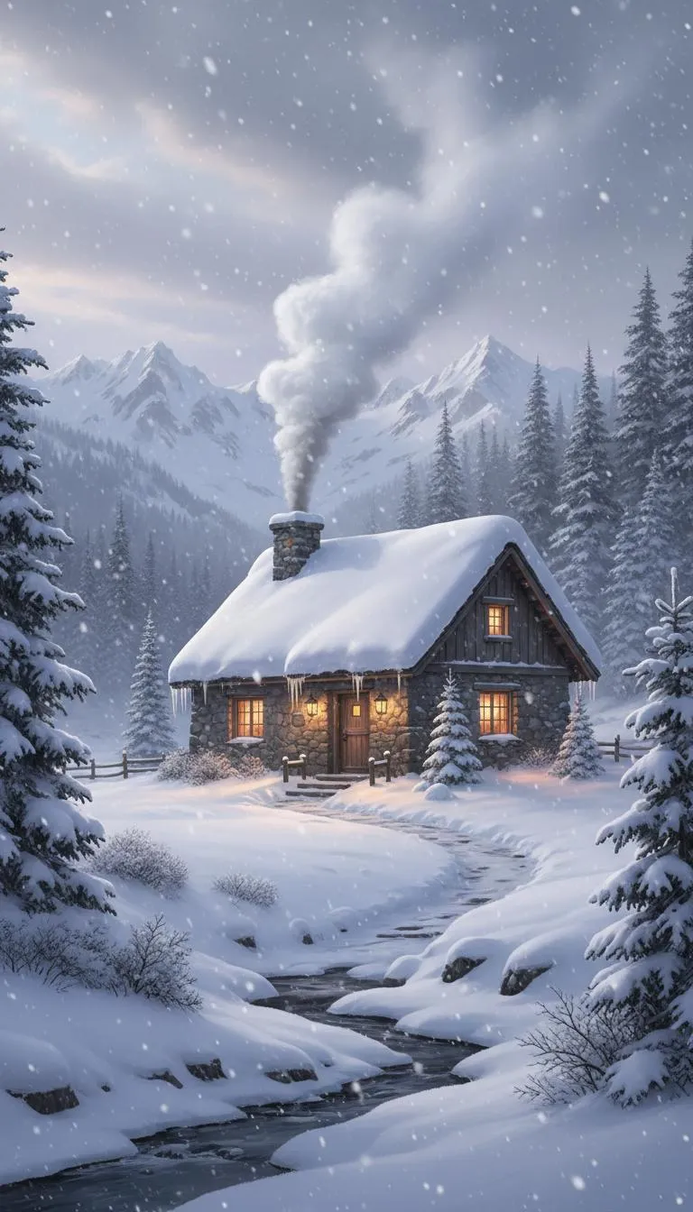 Generate a stunning AI image of a cozy winter cottage on a mountain. Crisp snowfall blankets the scene while warm smoke curls from the chimney. Use this text-to-image prompt to create a peaceful winter scene with vivago.ai's AI art tools. Perfect for serene landscapes.