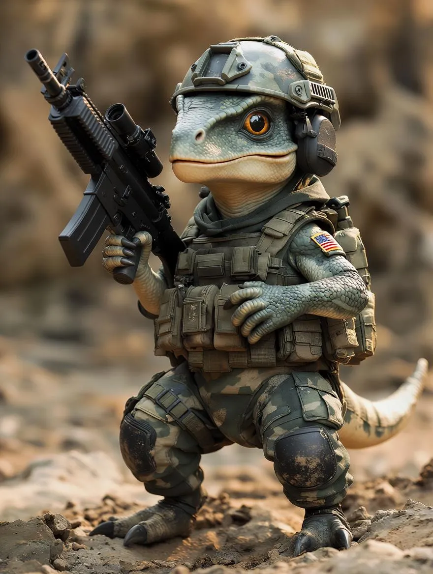 a badass baby velociraptor in army gear holding a machine gun, cute but deadly