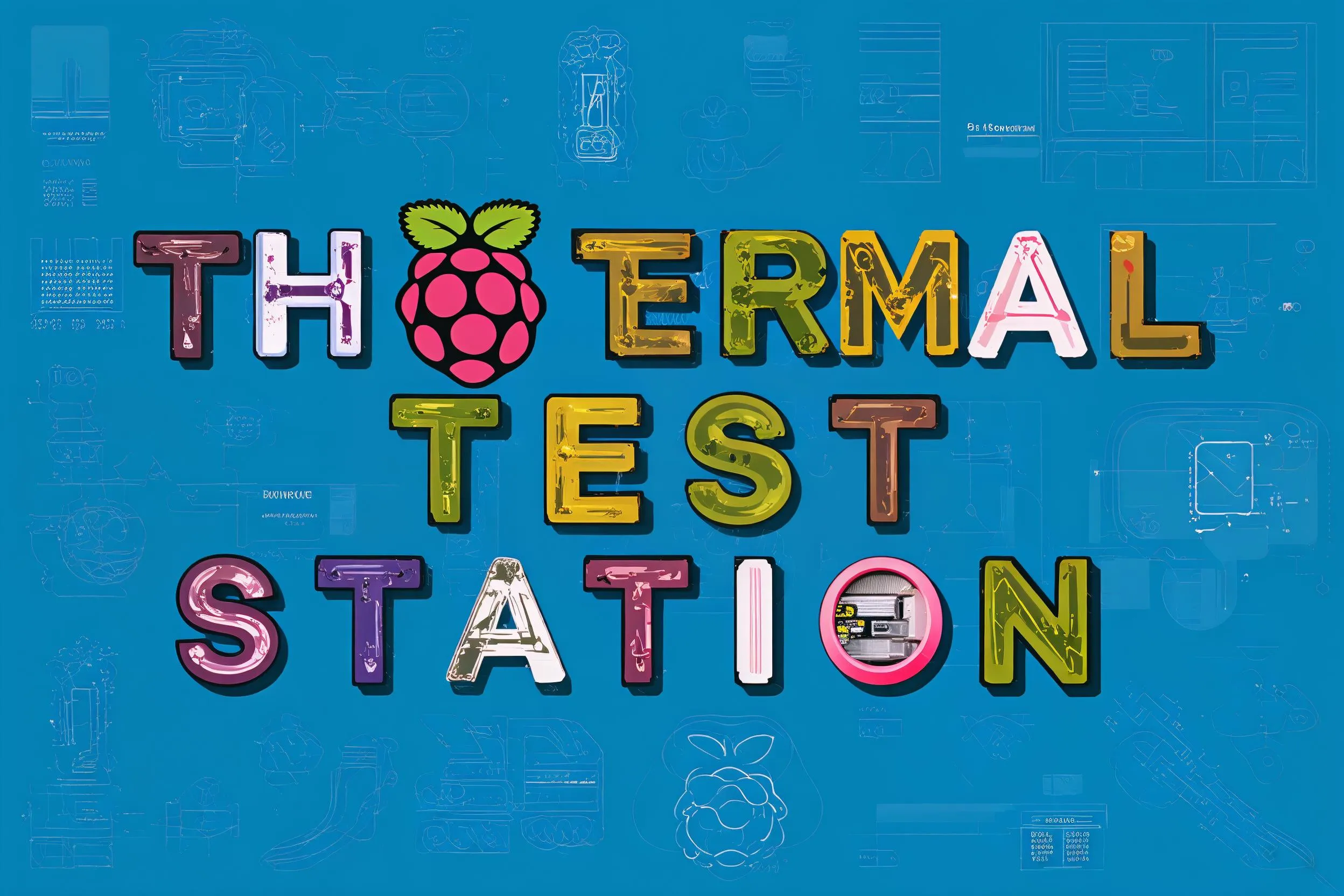 Wygeneruj grafikę dla ekranu startowego raspberry pi z napisem Thermal Test Station. Pierwsze litery każdego słowa z wielkiej litery w innym kolorze. Dodaj grafiki w tle w temacie magazynów energii i raspberry pi. Kolor bazowy tła: Scania Blue.