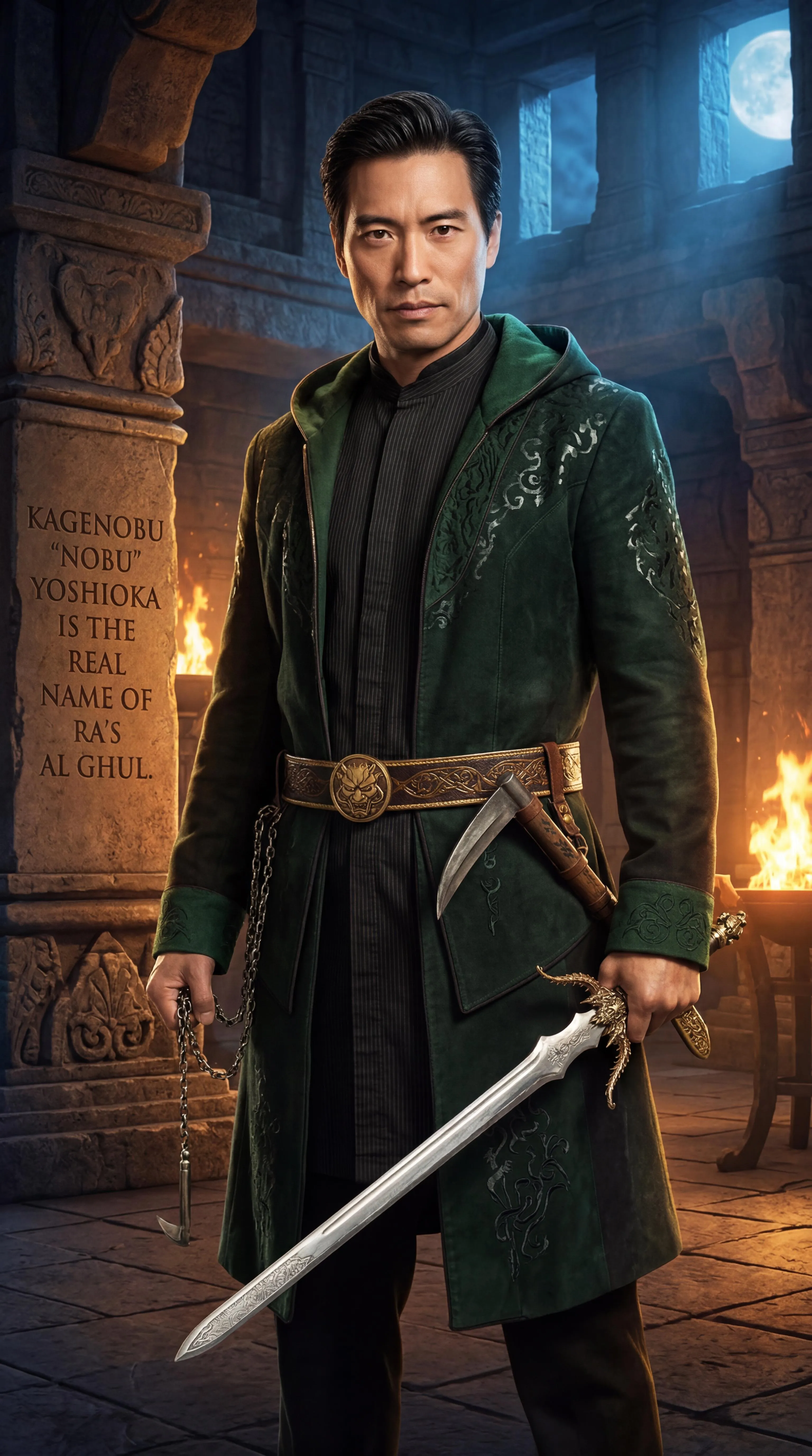 Kagenobu "Nobu" Yoshioka (portrayed by Peter Shinkoda) from the Marvel Cinematic Universe and Ra's al Ghul (portrayed by Matt Nable) from the Arrowverse interchangeably combine together into each other as one, facial and physical features and outfits alike, to become an amalgamation in which Kagenobu "Nobu" Yoshioka is the real name of Ra's al Ghul. There are no cuts or bruises, nor are there any band-aids. No sensitive information or guidelines violating content seen or involved.
