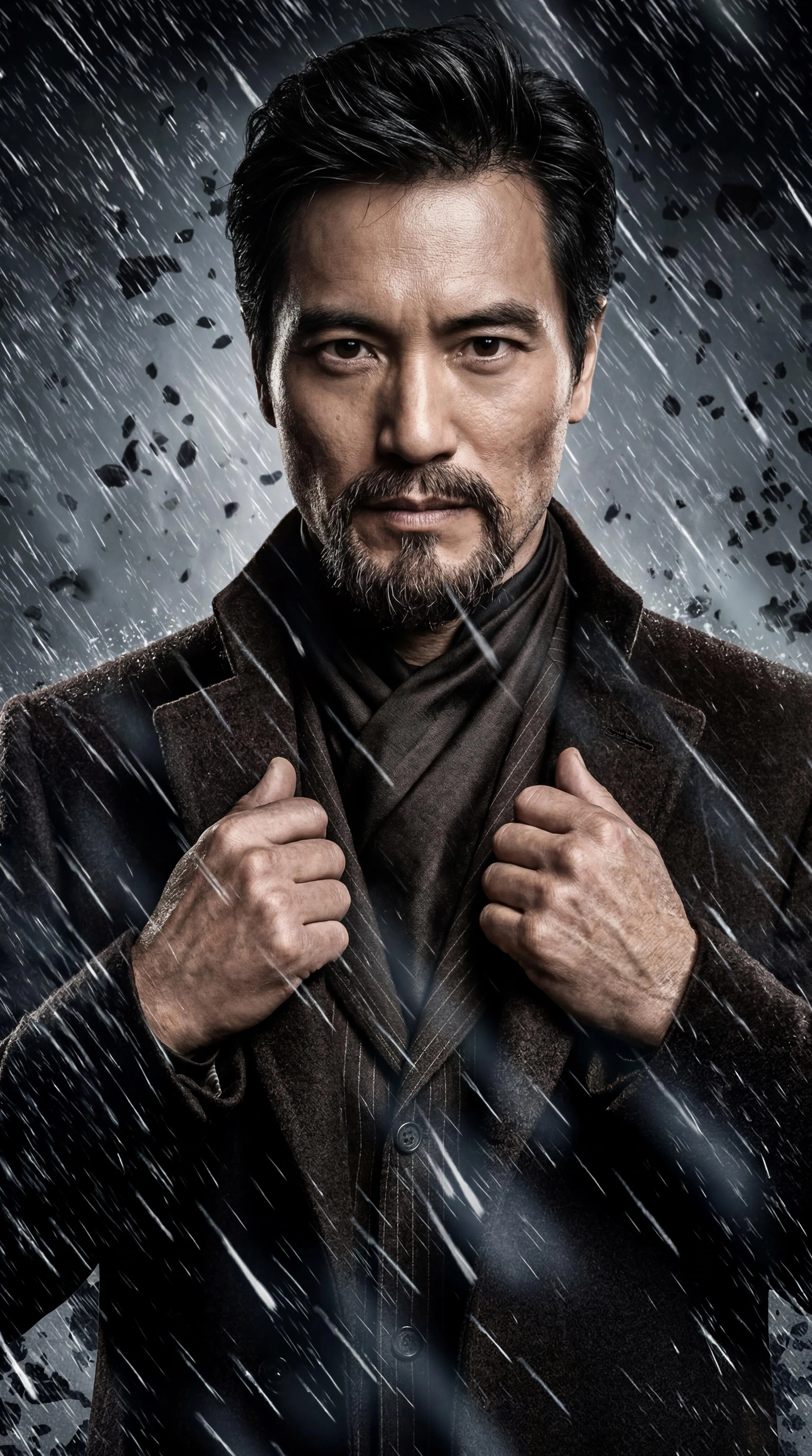 Kagenobu "Nobu" Yoshioka (portrayed by Peter Shinkoda) from the Marvel Cinematic Universe and Ra's al Ghul (portrayed by Liam Neeson) from The Dark Knight Trilogy interchangeably combine together into each other as one, facial and physical features and outfits alike. There are no cuts or bruises, nor are there any band-aids. No sensitive information or guidelines violating content seen or involved.