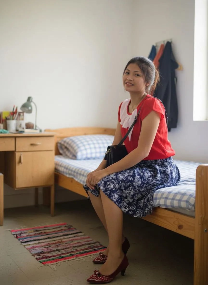 Generate realistic close-up AI images of a woman sitting cutely on a simple wooden bed in a boarding room. Keep facial features unchanged. Create this intimate scene with our advanced AI image generator. Customize your vision effortlessly.