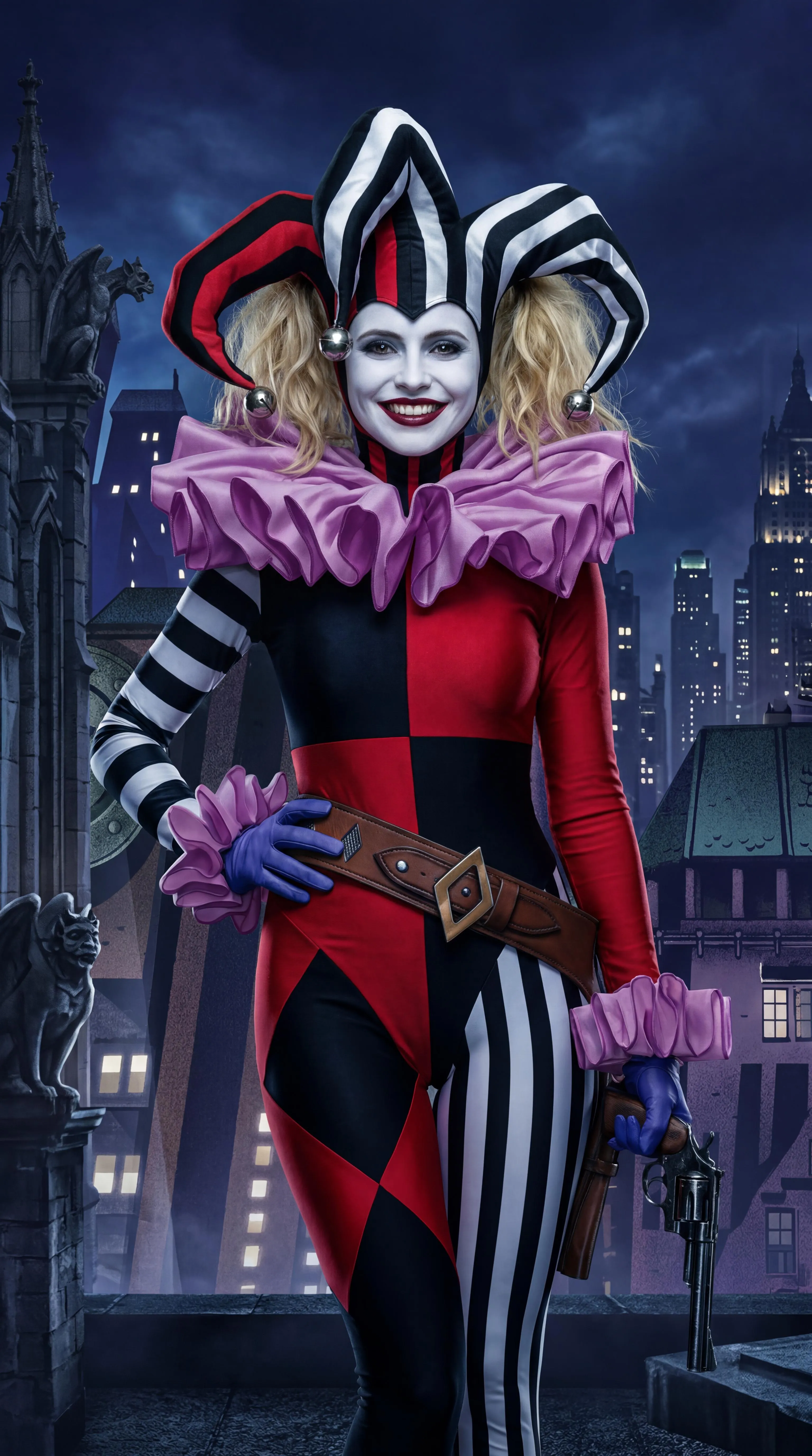 The art style of Harley Quinn from Batman '89 is visually translated into the live-action aesthetic of Cassidy Alexa's portrayal of Harley Quinn voiced by Tara Strong in the Arrowverse, thus replacing her yellow A.R.G.U.S. jumpsuit with her trademark costume seen in the art. There is not portion of the Bat-Signal shining in the background. No sensitive information or guidelines violating content seen or involved.
