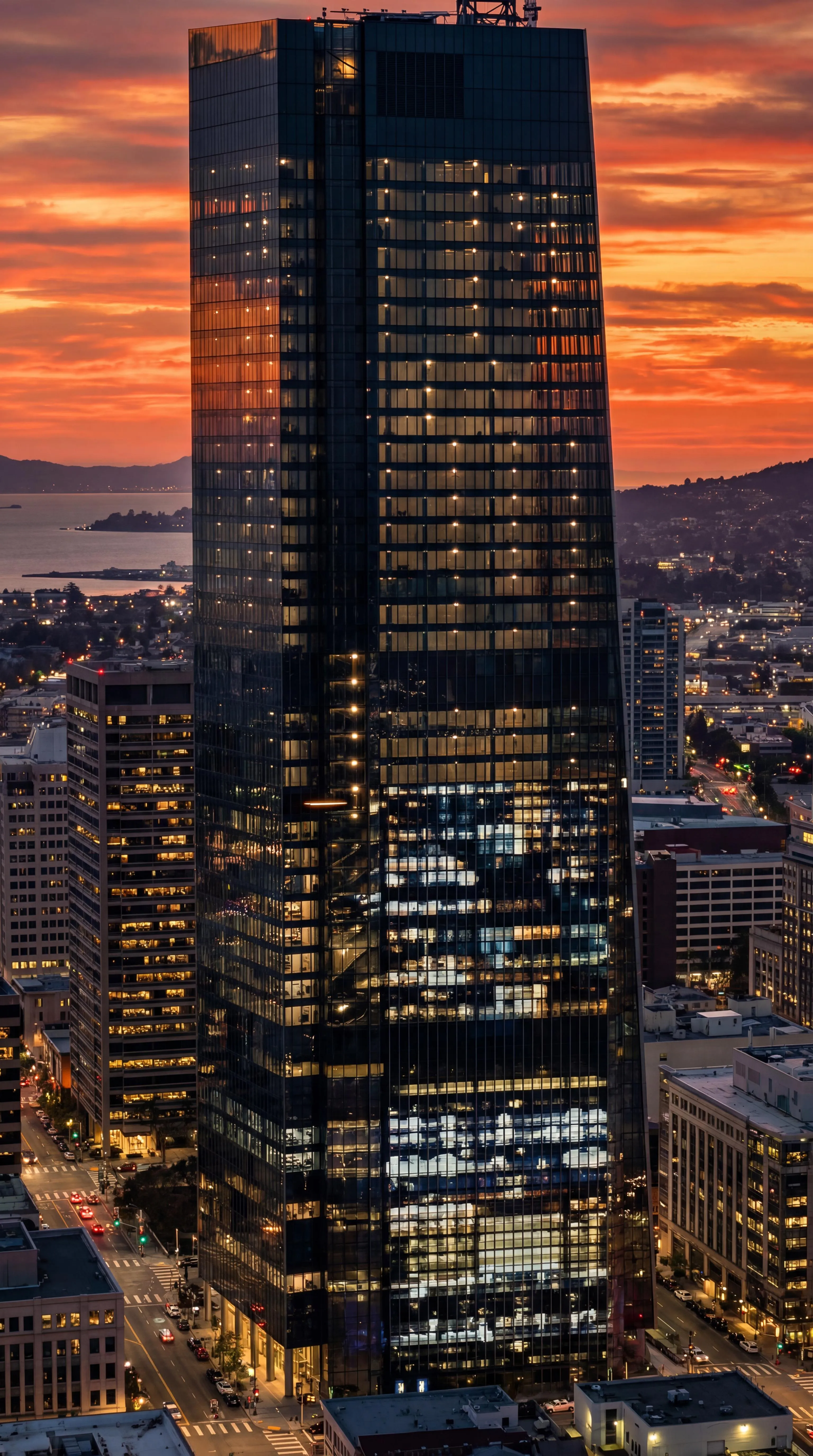 Generate the Corp Industries Tower in Oakland with Vivago.ai's AI effects. Combine Marvel's Oscorp and DC's Luthor Corp towers into one futuristic corporate HQ. Features iconic merged lighting effects, located in Oakland's financial district. Create unique Marvel DC crossover architecture using AI image generation.