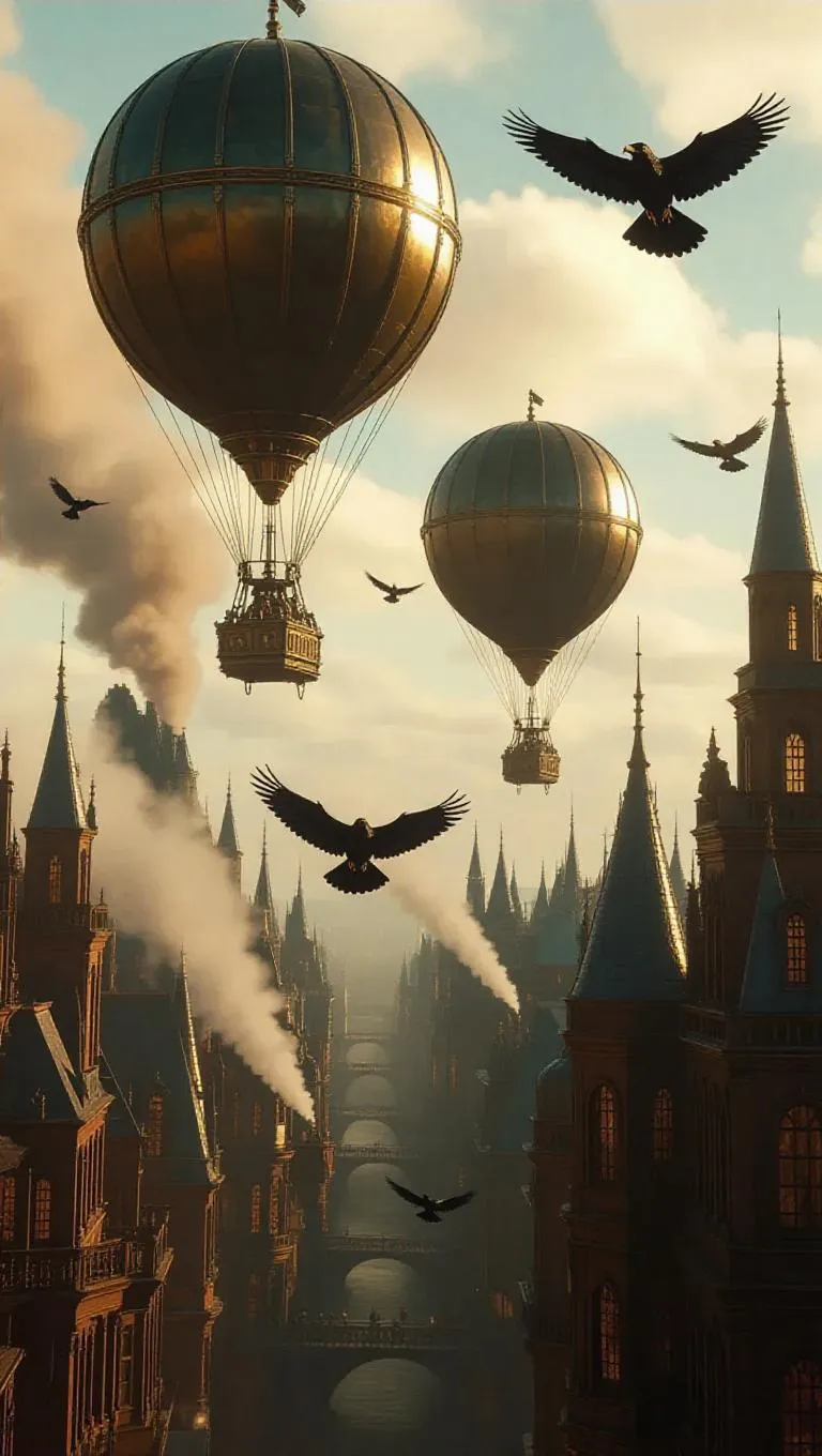 Steampunk style battle between Ravens and steam airships in the sky over the Steampunk style city. Ravens peck the airships dirigible balloons and damage them, the steam comes out from balloons