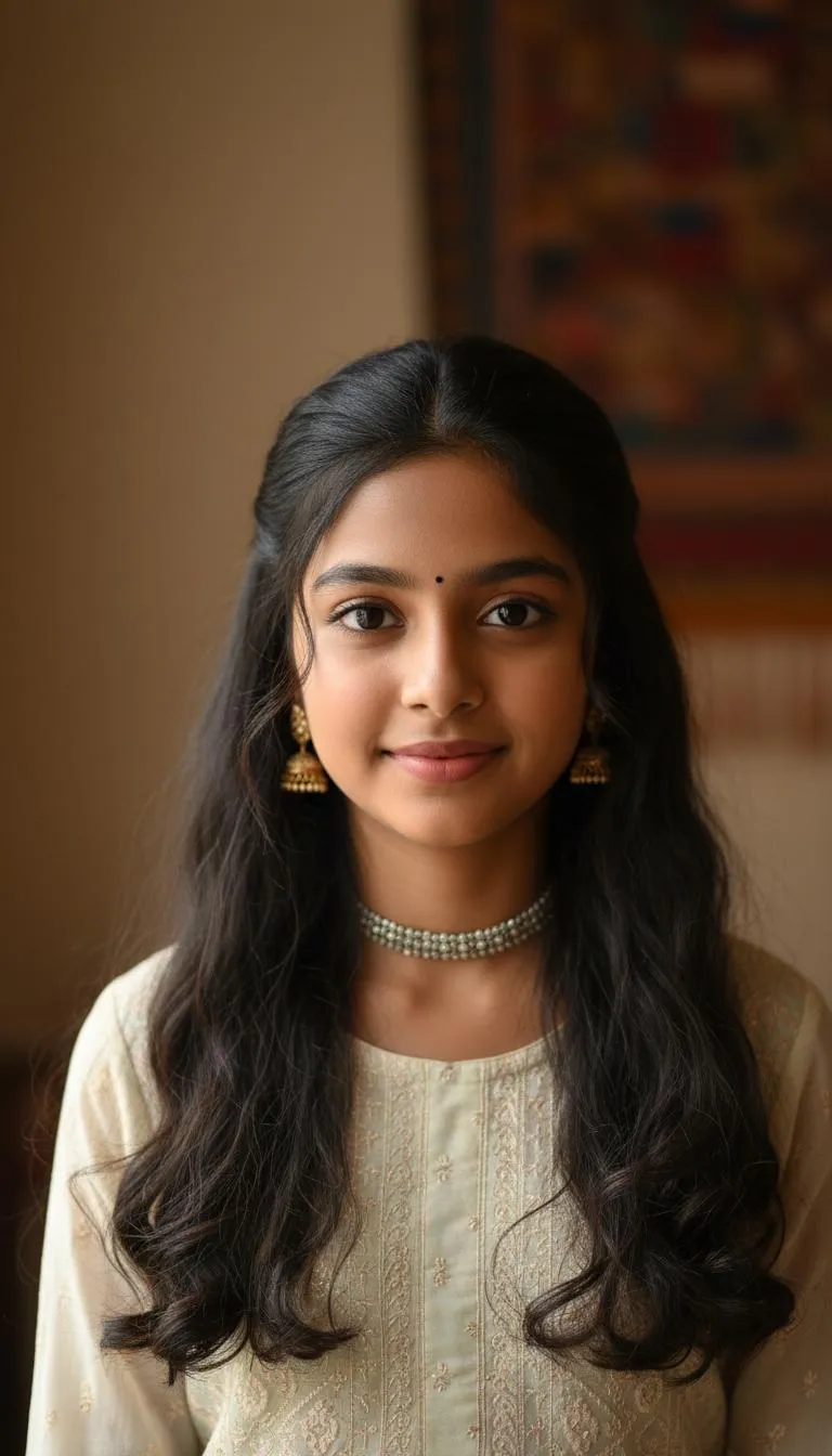 Generate a stunning, realistic AI portrait of a young Indian girl. Features long wavy black hair half-up, traditional gold jhumka earrings, silver choker, & black bindi. Soft natural daylight, front-facing view. Create high-quality, detailed Indian portraits with vivago.ai's AI image generator.