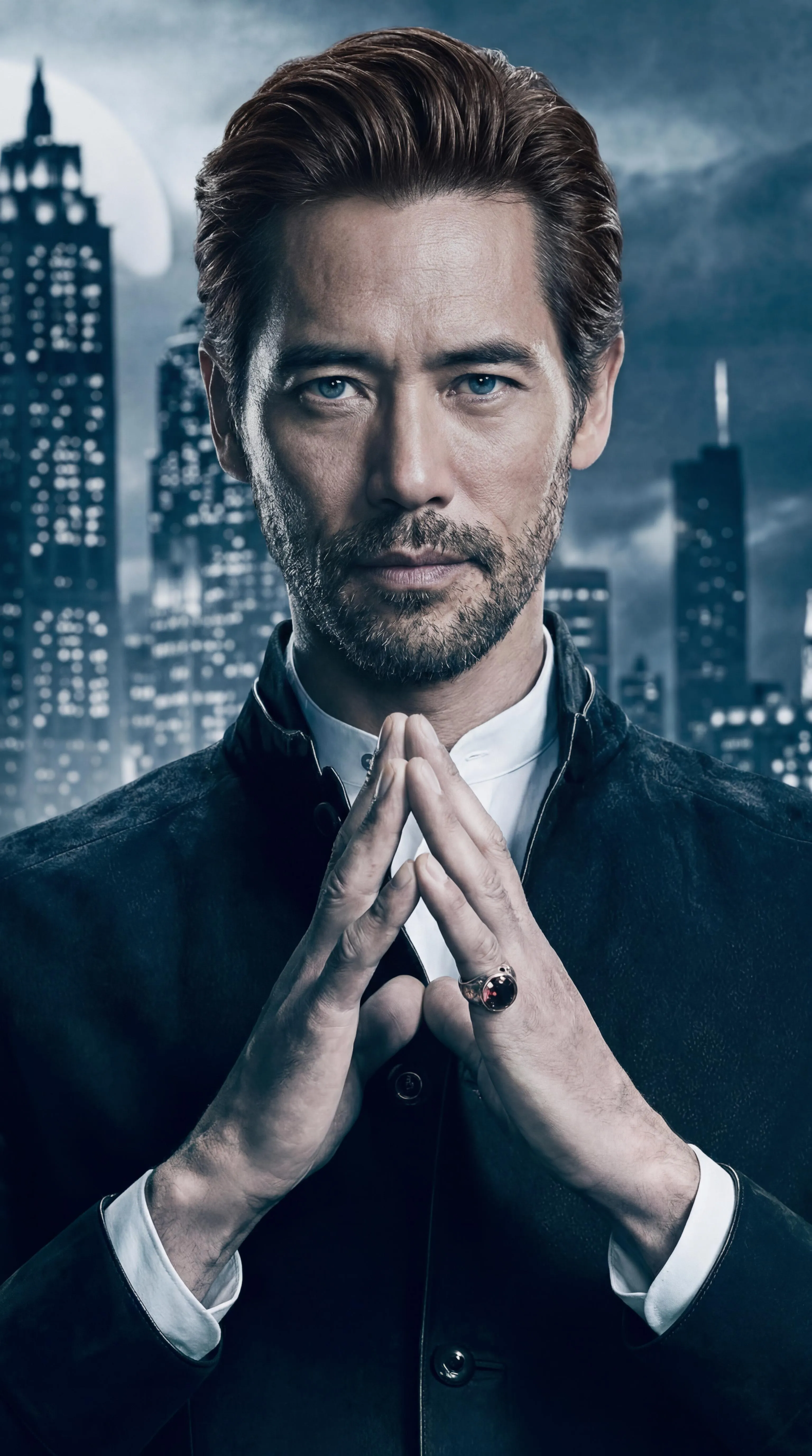 Kagenobu "Nobu" Yoshioka (portrayed by Peter Shinkoda) from the Marvel Cinematic Universe and Ra's al Ghul (portrayed by Liam Neeson) from the T.V. series Gotham interchangeably combine together into each other as one, facial and physical features and outfits alike. No sensitive information or guidelines violating content seen or involved.