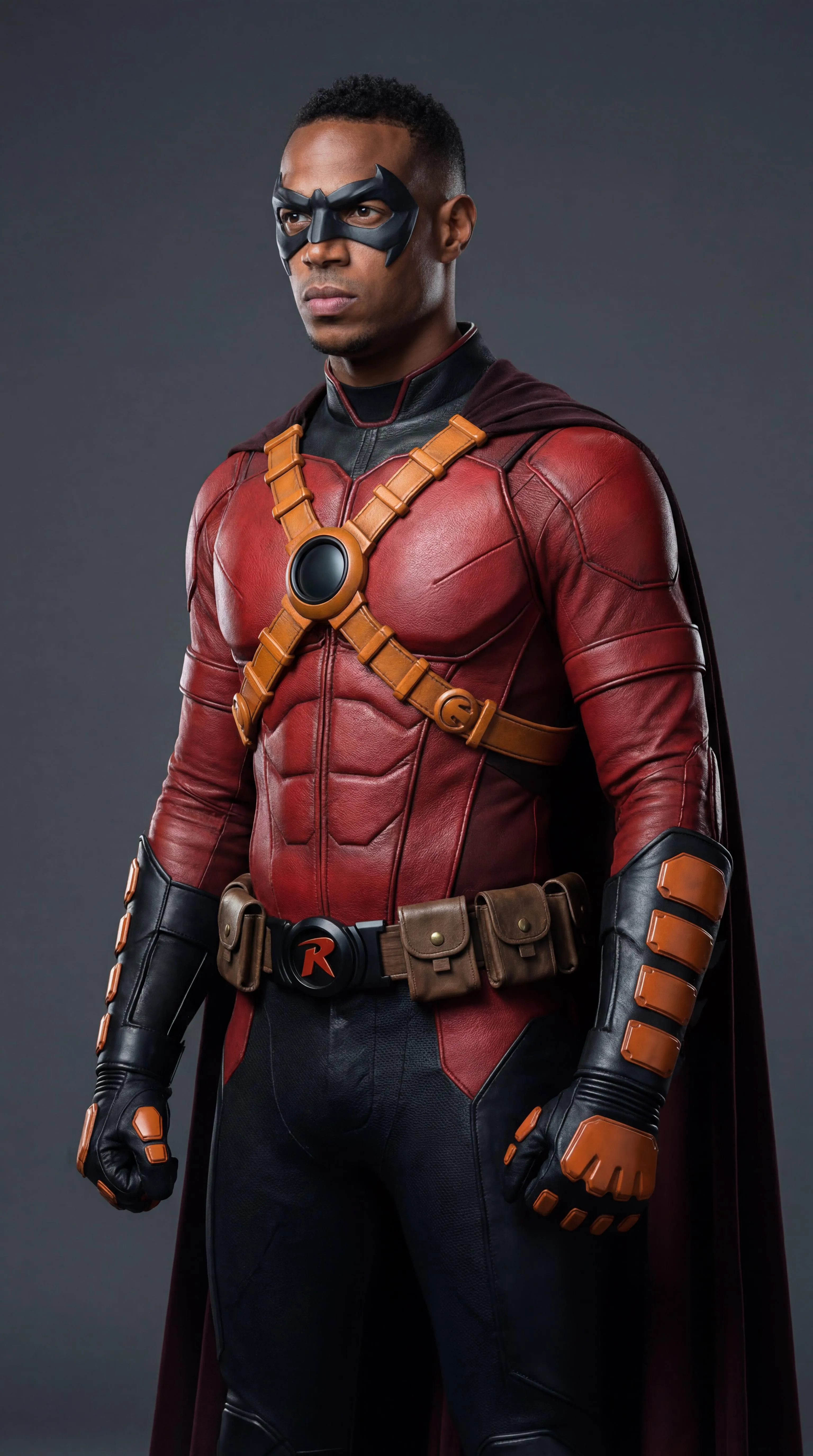 Marlon Wayans becomes the Red Robin, visually translating the comic book style of the Red Robin image into the realistic aesthetics of the other imagery. He is surrounded by a blank background, and the "R" logo is only on the black circular center of the suit's chest belt. The nipples seen on the exterior of the Robin suit are not present, nor is he surrounded by comic book merch or confronting anyone. No sensitive information or guidelines violating content seen or involved.