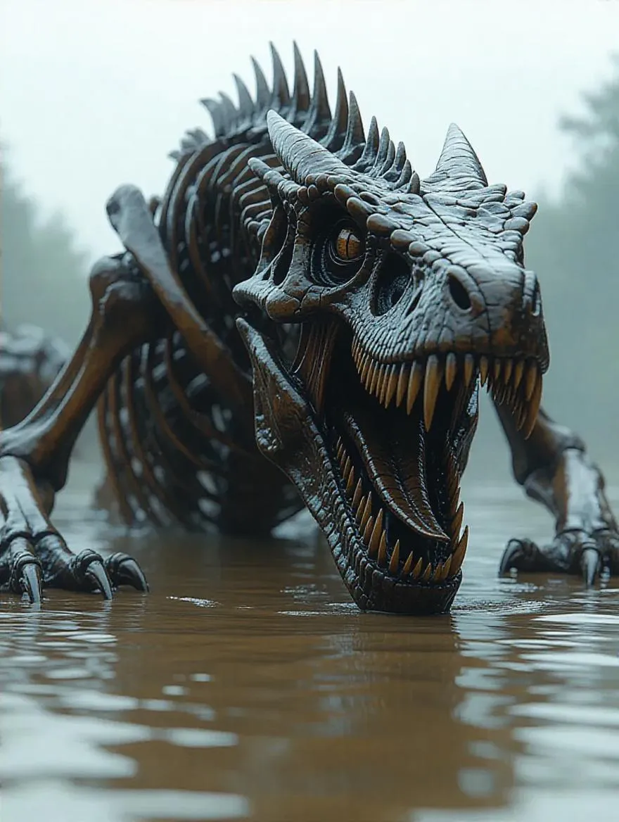 On the muddy surface of the water, a colossal skeletal dragon slowly emerges, fully revealed. Its massive jaw opens, exposing sharp, menacing fangs. The scene is intensely realistic, with the dragon's bones glistening in the dim light, creating a haunting and eerie atmosphere.
