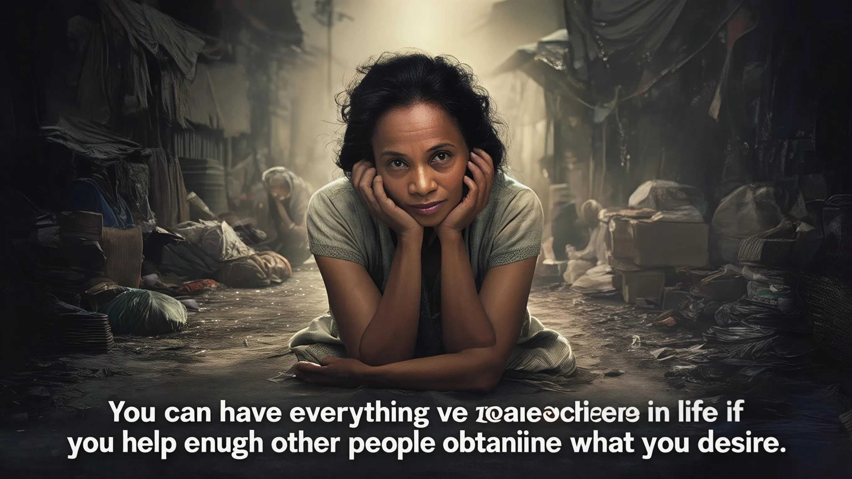 Create an emotional, motivational story video about a poor woman who struggled to survive but changed her life by helping others get what they wanted. Start with her being broke, ignored, and desperate. Show how she begins helping people selflessly—solving problems, giving value, and building trust. Gradually, her life transforms: she gains opportunities, money, and respect. End with the message: “You can have everything you want in life if you help enough other people get what they want.” Tone should be emotional, inspiring, and cinematic. Include uplifting background music and a powerful ending.