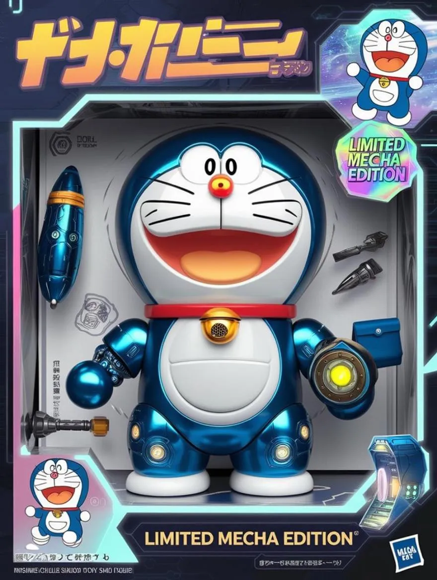 Limited Mecha Edition Doraemon anime collectible figure with sleek metallic armor, glowing accents, and interchangeable mecha accessories. Premium anime-style packaging includes holographic sticker, cel-shaded artwork, and sci-fi Tokyo backdrop. High-detail sculpt, dramatic lighting—perfect for anime enthusiasts and toy collectors seeking exclusive, tech-inspired designs.