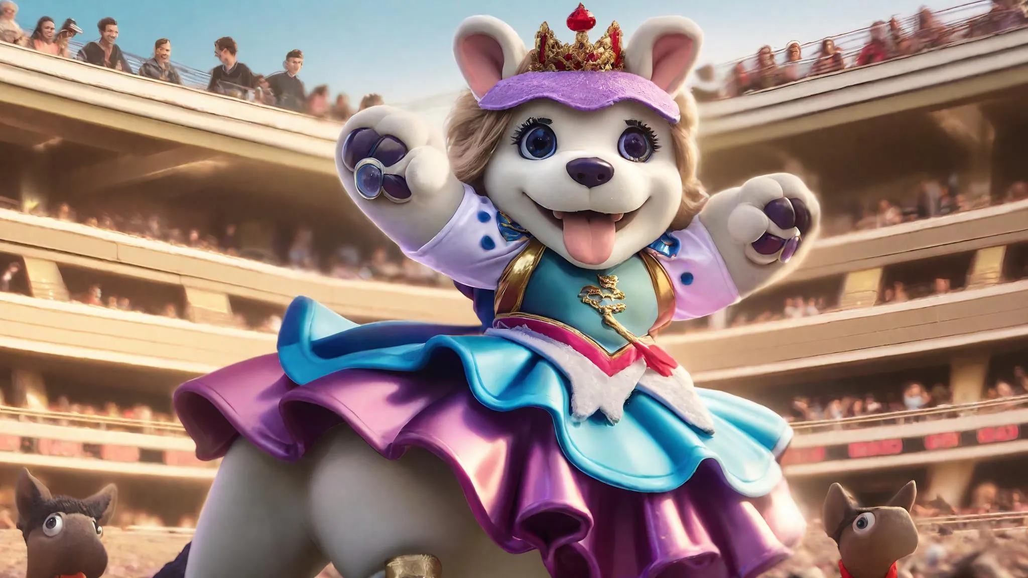 In Apple iStadium Rodeo Stadium In Apple iCastle. 1 Dog Mascot Princess Hopping On Her Color Matching 4 Legged Bull’s Back. Human Kid Watching 1 Dog Mascot Princess Riding On Her Color Matching 4 Legged Bull’s Mascot’s Back While Color Matching 4 Legged Bull Mascot Jump, Shake, Kick, Wiggle, Spin To The Right While 1 Dog Mascot Is On Her Color Matching 4 Legged Bull’s Mascot’s Back. Remember?. No Cartoons, No 3d Animations, No Cinemas, No Films, Just Cameras With Character Fit In HD Widescreen Frames, Just Camcorders With Character Fit In HD Widescreen Frames, Just Scenes, Just Styles, Just Music, Just Filters, Just Giant Fresh Clean Giant Soft Refurbish Plush Mascot Costume With Feet And Paws And Giant Fresh Clean Soft Refurbish Plush Huge Mascot Head, Just Tidy, Just Giant Cuddly, Giant Huggable, Giant Soft