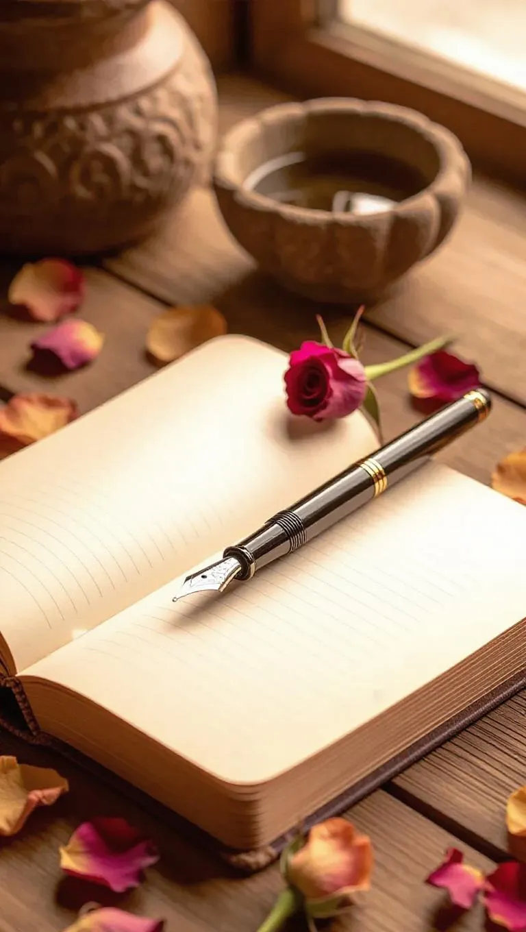 Capture nostalgic charm with AI-generated imagery of a vintage diary on a wooden desk, bathed in warm golden light. A fountain pen and dried rose petals enhance the emotional ambiance. Sepia tones evoke solitude, memory, and poetic reverie. Transform text prompts into evocative visual stories with Vivago.ai.