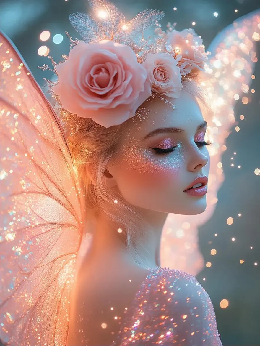 Fée rose de face, robe étincelante et ailes phosphorescentes, fond pastel avec des effets magiques, lumières chatoyantes et particules scintillantes, ambiance enchantée et féerique.