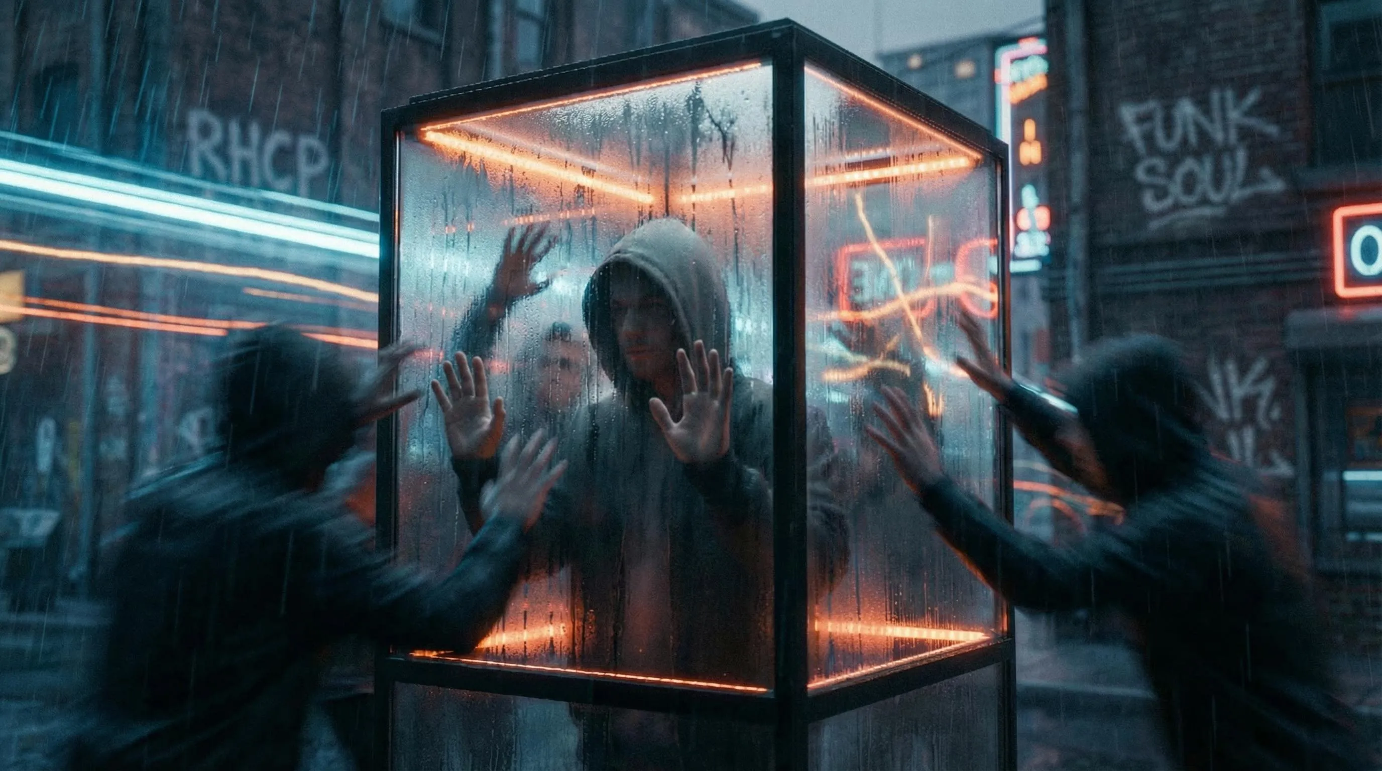 The person in the glass box, shadows moving outside, hands reaching outward, urban textures blending with soft light streaks, funky RHCP groove vibes, cool blue and warm orange highlights, cinematic depth, subtle motion, dramatic mood, dynamic perspective suggesting tension and energy