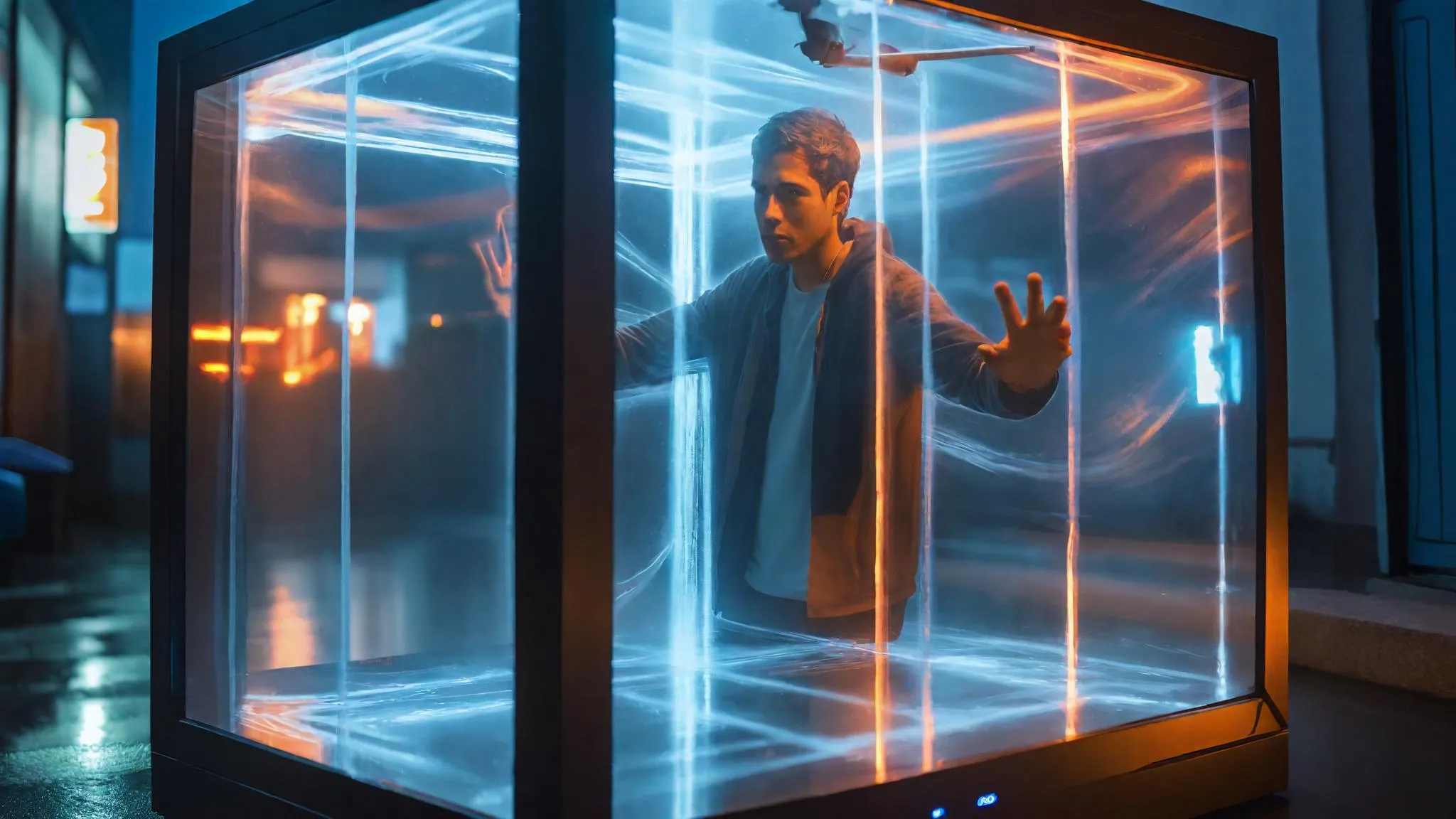 The person in the glass box, shadows moving outside, hands reaching outward, urban textures blending with soft light streaks, funky RHCP groove vibes, cool blue and warm orange highlights, cinematic depth, subtle motion, dramatic mood, dynamic perspective suggesting tension and energy
