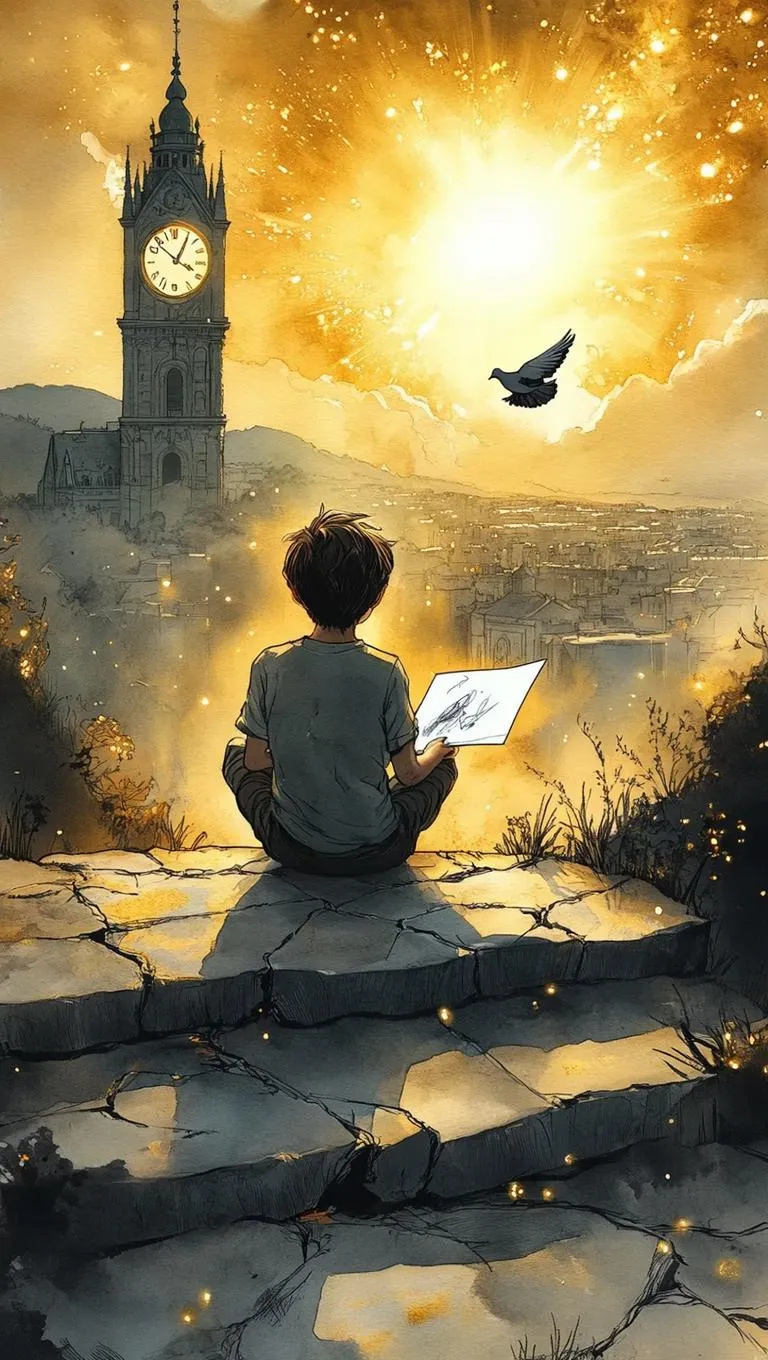Create AI-generated anime art with cinematic watercolor scenes using Vivago.ai. Transform prompts into radiant, golden-ink effects and glowing textures. Craft nostalgic storytelling visuals—fading lines, glowing clocktowers, and ethereal skies. Perfect for cinematic anime styles, memory-inspired art, and professional-grade watercolor edits. Elevate creativity with AI-powered golden ink and glowing effects.