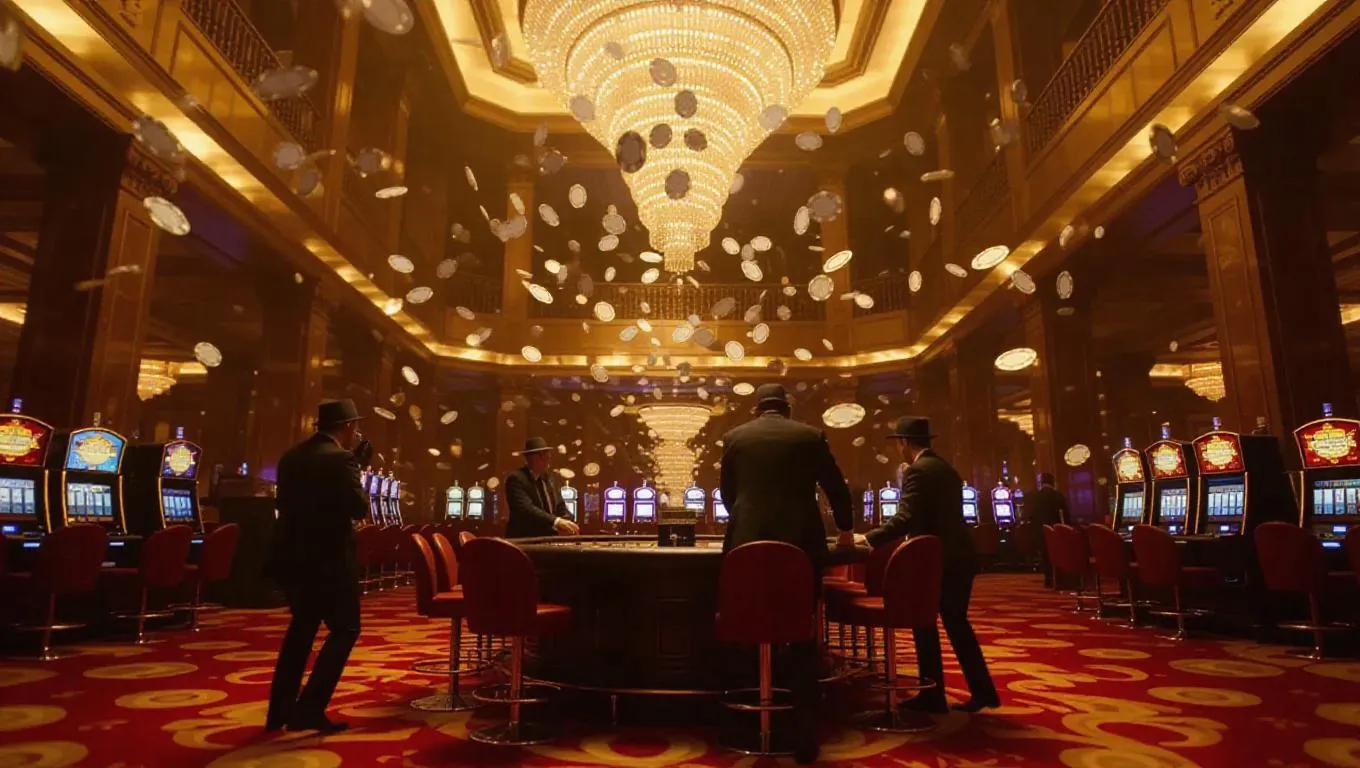 A dramatic casino heist in progress, resourceful thieves planting a false fire alarm in a grand atrium, glittering chips and money caught midair in slow motion. Giant kinetic sculptures and textured carpets contrast the chaos. Dynamic overhead angle shot, freeze-frame intensity with sparkling golden lighting.