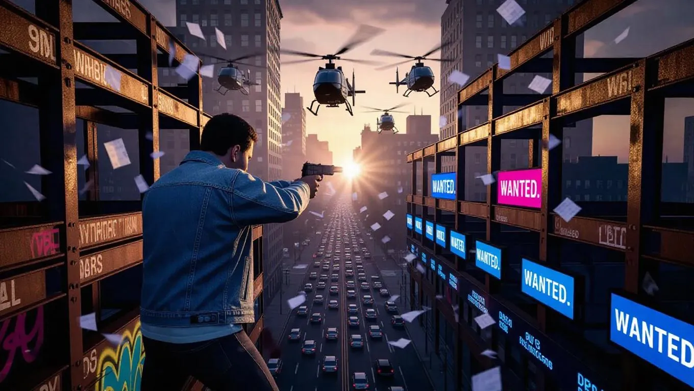 A rooftop standoff unfolds at dusk atop a shattered skyscraper, where a lone gangster in a faded denim jacket levels a pistol at encroaching SWAT units. Helicopter rotors churn the dusky air, sending paper debris and dust spiraling across the skyline. Below, traffic snarls in a sea of headlights, while digital billboards flash “WANTED” warnings in glitchy effects. Tension crackles in the haze, accentuated by sun flares slicing between rusted steel beams and graffiti walls. Dynamic third-person composition, chiaroscuro contrasts with cybernetic hues.